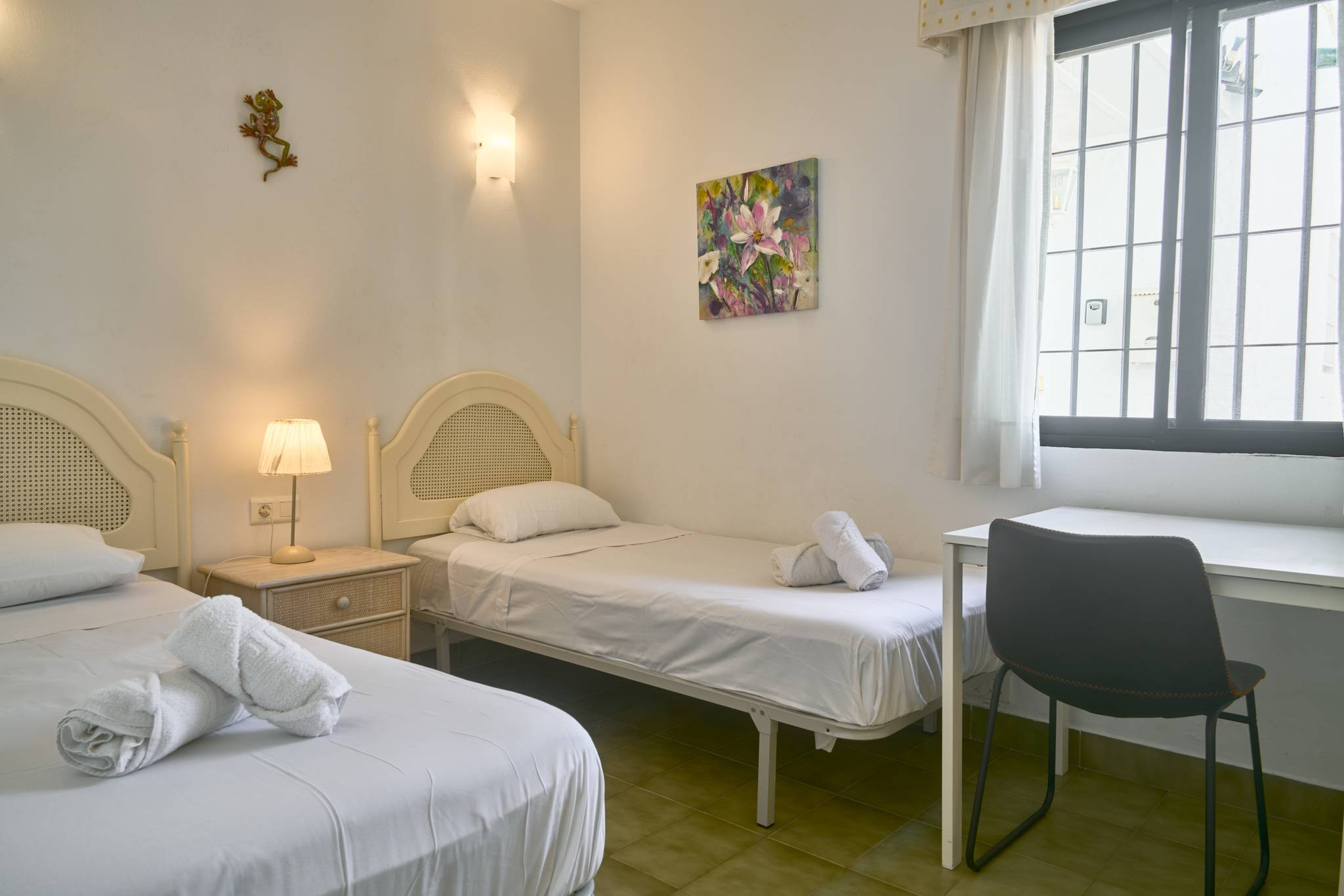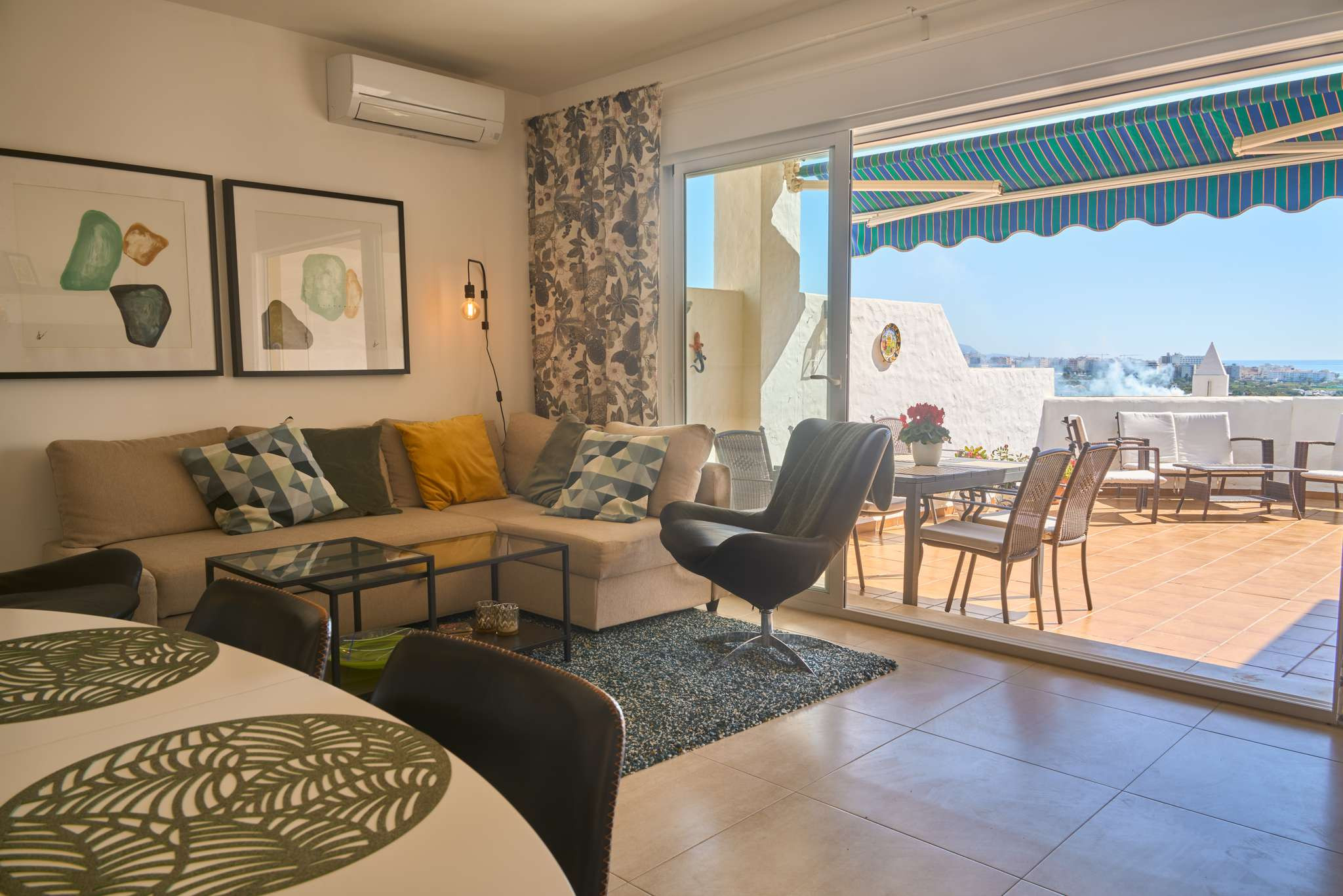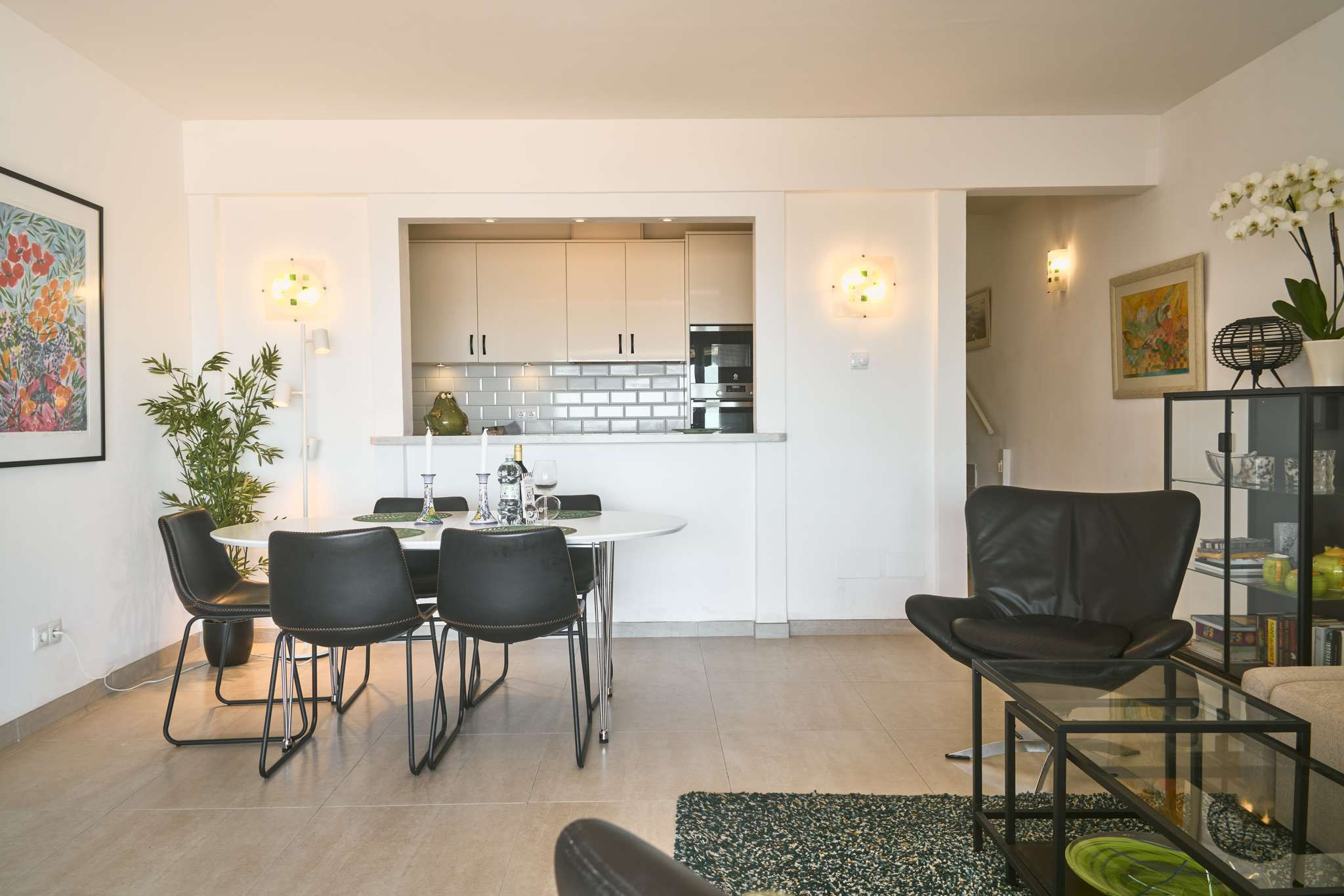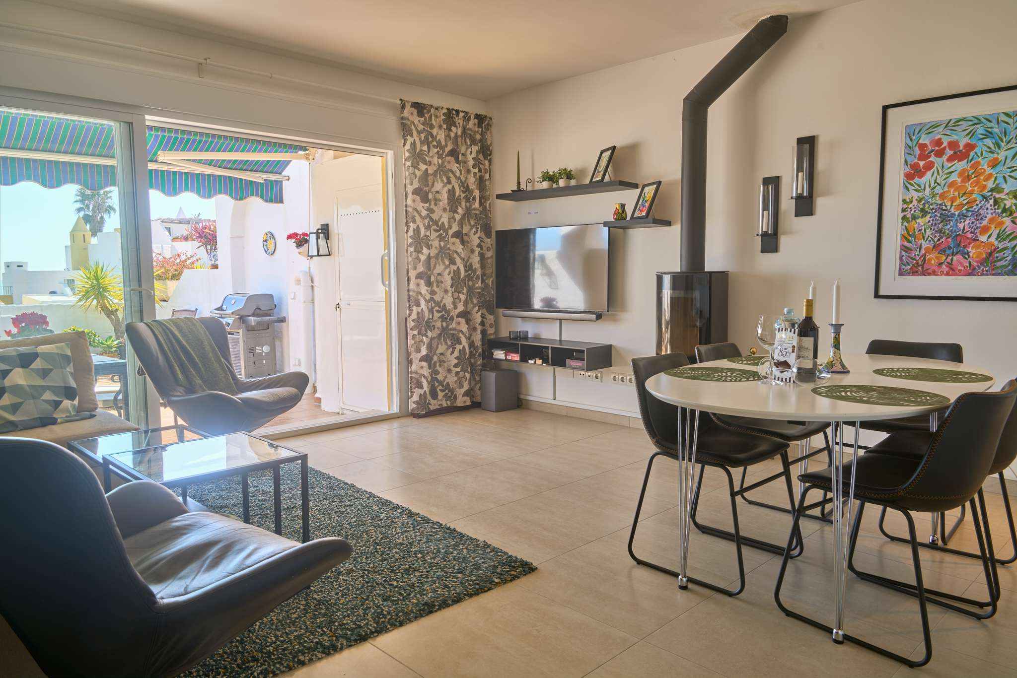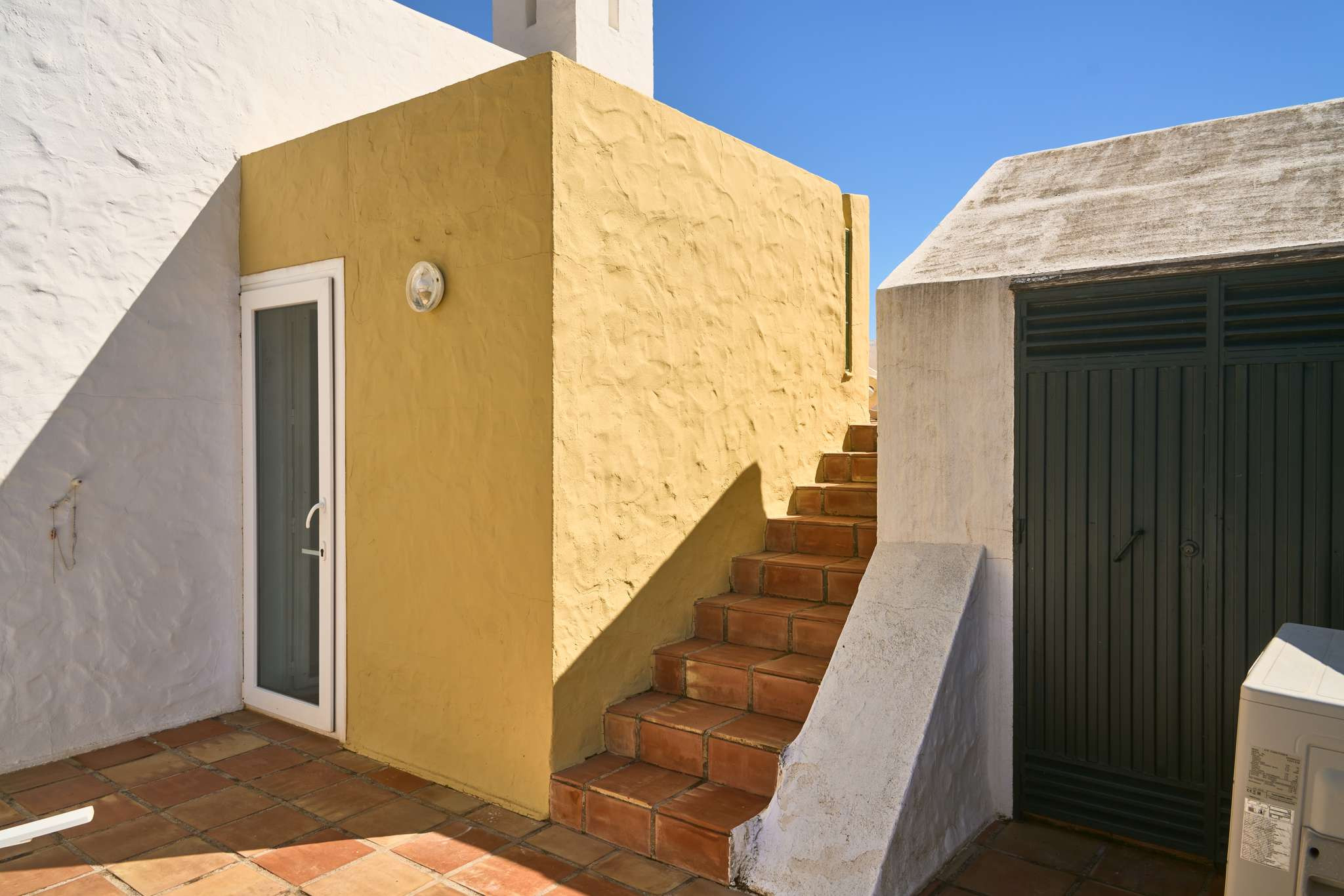 Die Wohnung ist effizient aufgeteilt, um ihren 4 Bewohnern Privatsphäre zu bieten. Auf der unteren Etage finden Sie ein geräumiges Wohn-Esszimmer mit direktem Zugang zur Hauptterrasse sowie eine Küche mit Geschirrspüler, Mikrowelle und allen notwendigen Utensilien für längere Aufenthalte. Diese Etage verfügt über ein Schlafzimmer mit zwei Einzelbetten und ein Badezimmer mit Dusche. Eine Ebene höher befindet sich das Hauptschlafzimmer mit Doppelbett, privatem Badezimmer und einem separaten Balkon, sodass jedes Paar oder Familienmitglied seinen eigenen Rückzugsort hat.Terrassen auf mehreren Ebenen und privates Solarium