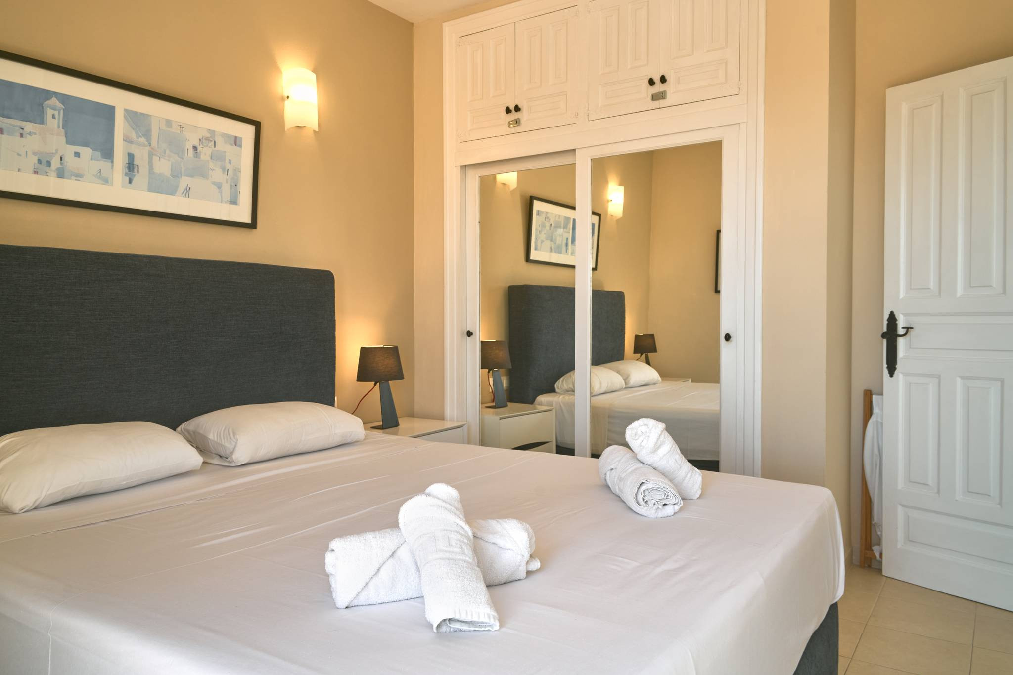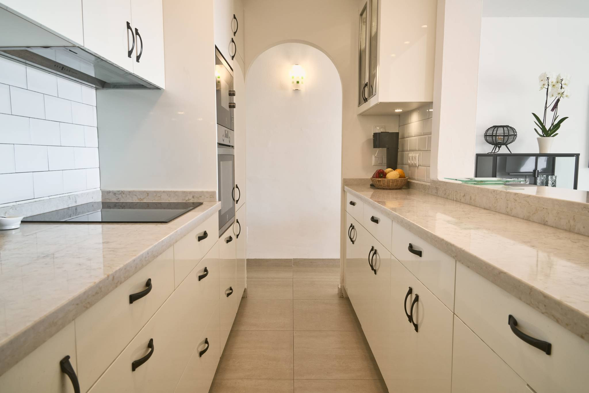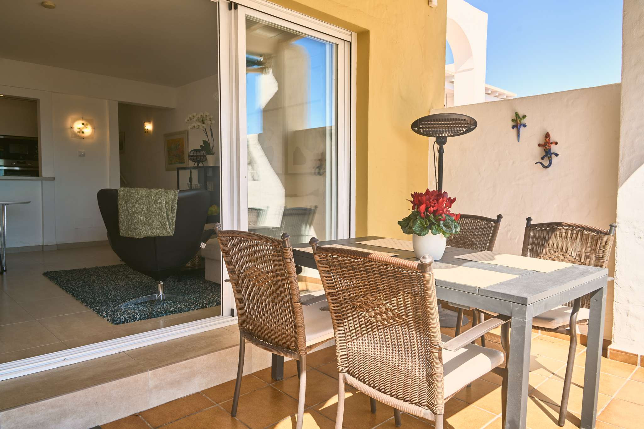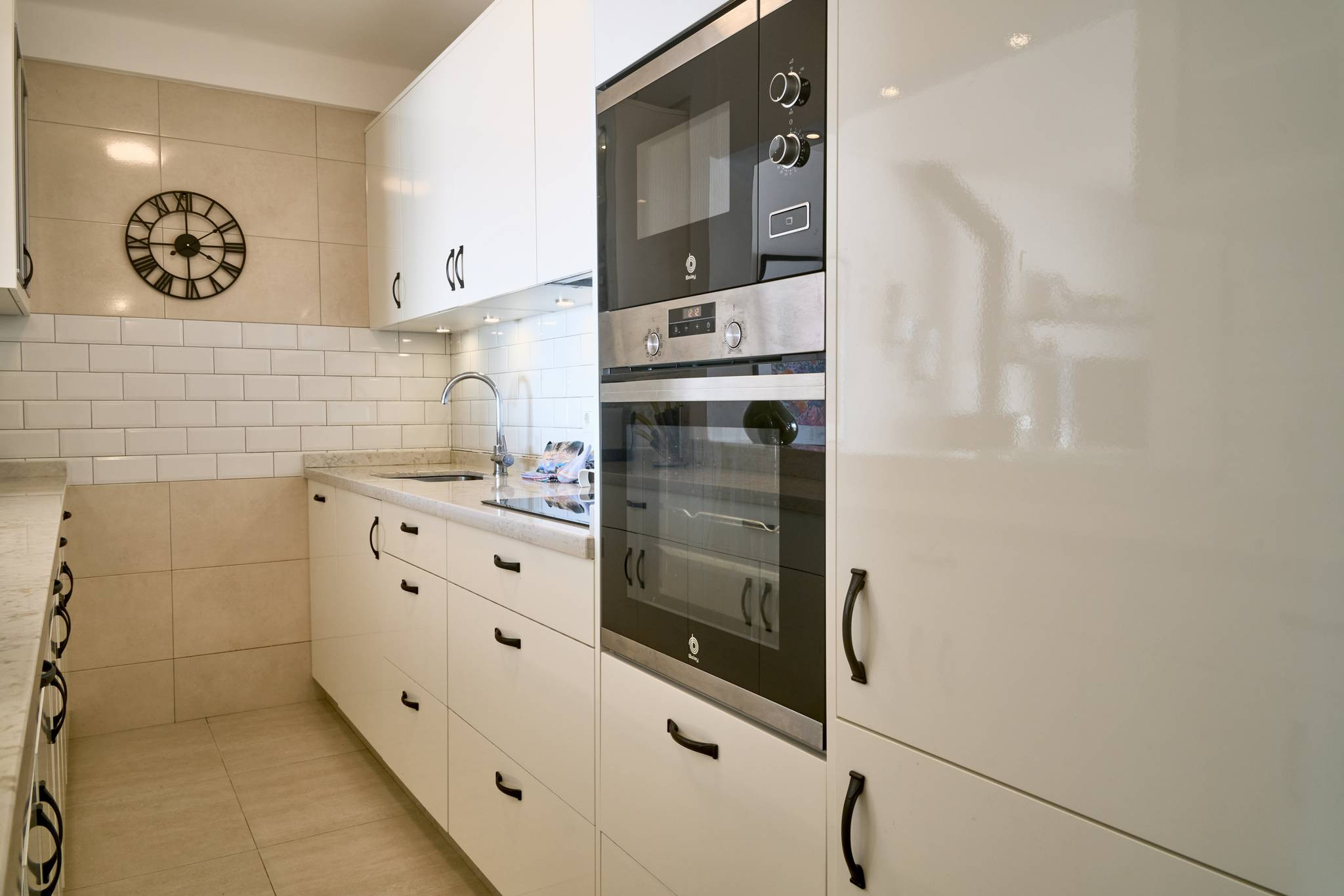 Die Wohnung ist effizient aufgeteilt, um ihren 4 Bewohnern Privatsphäre zu bieten. Auf der unteren Etage finden Sie ein geräumiges Wohn-Esszimmer mit direktem Zugang zur Hauptterrasse sowie eine Küche mit Geschirrspüler, Mikrowelle und allen notwendigen Utensilien für längere Aufenthalte. Diese Etage verfügt über ein Schlafzimmer mit zwei Einzelbetten und ein Badezimmer mit Dusche. Eine Ebene höher befindet sich das Hauptschlafzimmer mit Doppelbett, privatem Badezimmer und einem separaten Balkon, sodass jedes Paar oder Familienmitglied seinen eigenen Rückzugsort hat.Terrassen auf mehreren Ebenen und privates Solarium