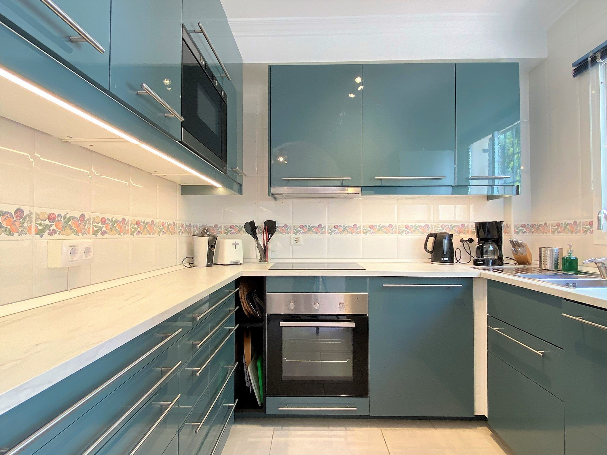 Die neue voll ausgestattete Küche bietet alles, was Sie für Ihren Urlaub benötigen, einschließlich Induktionskochfeld, Backofen, Mikrowelle und Geschirrspüler. Darüber hinaus ein komplettes Badezimmer und eine sonnige Terrasse (9 m2), mit Gartenmöbeln und Markise, mit Südwestausrichtung und spektakulärem Blick auf den Pool, das Meer, die Stadt und die Berge.
