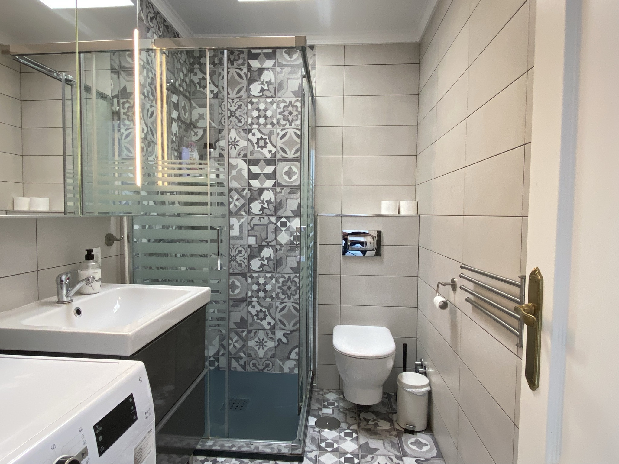 Außerdem befindet sich auf dieser Ebene ein modernes Bad mit Dusche, Waschmaschine (mit integriertem Trockner). Es gibt auch ein Bügeleisen/-brett und einen Haartrockner.