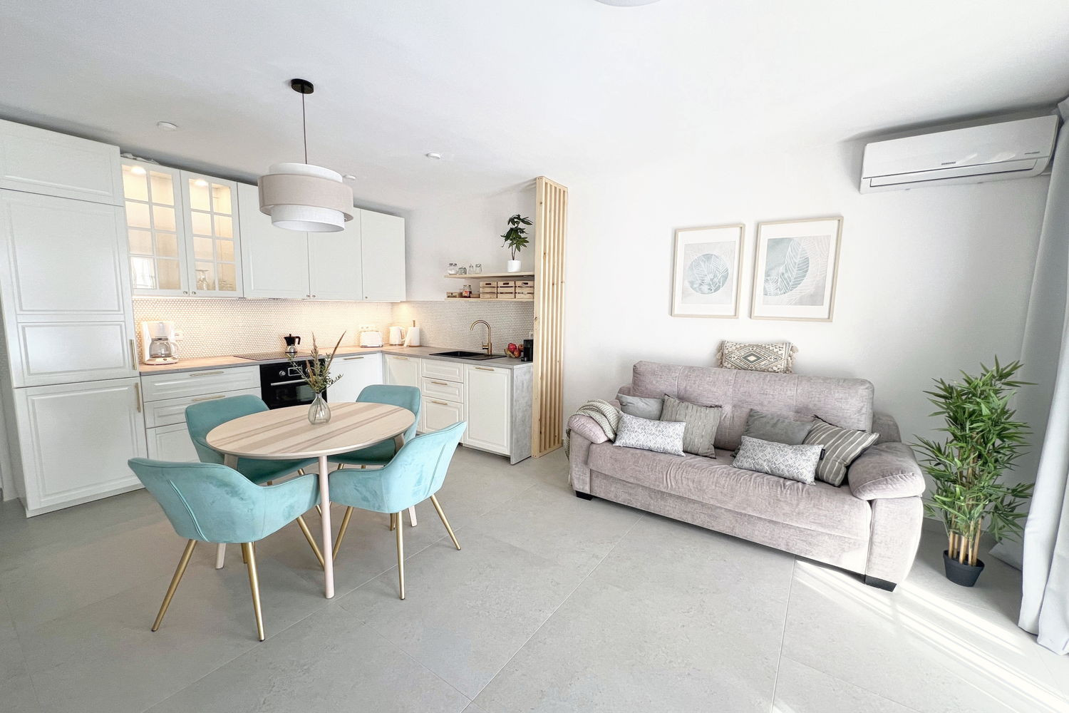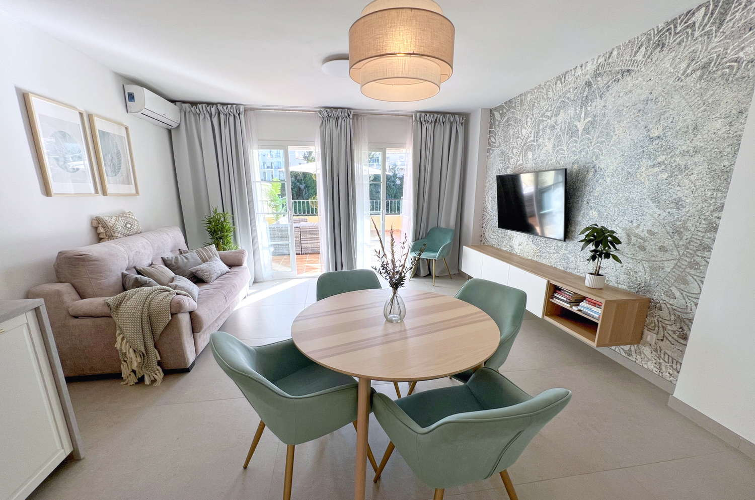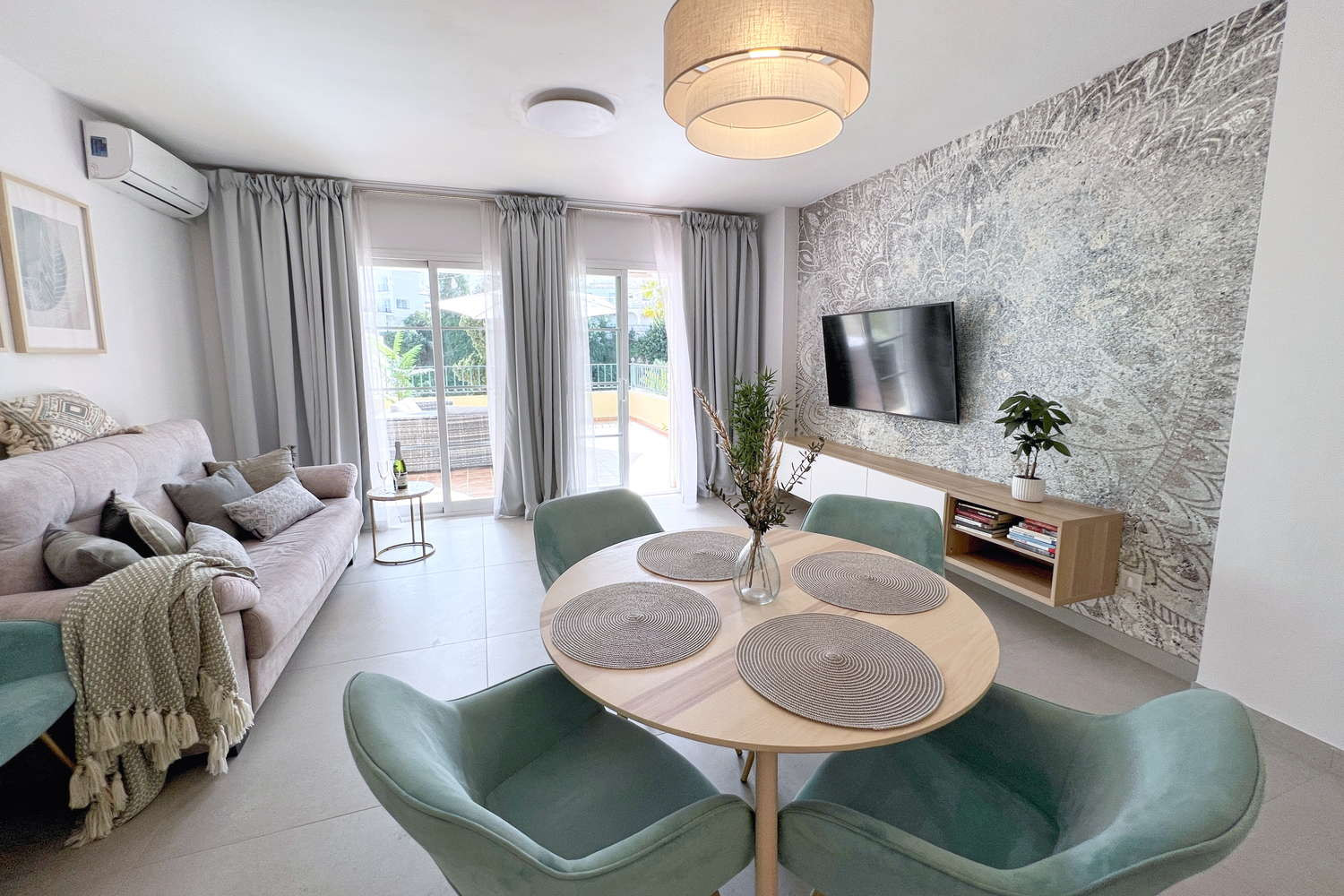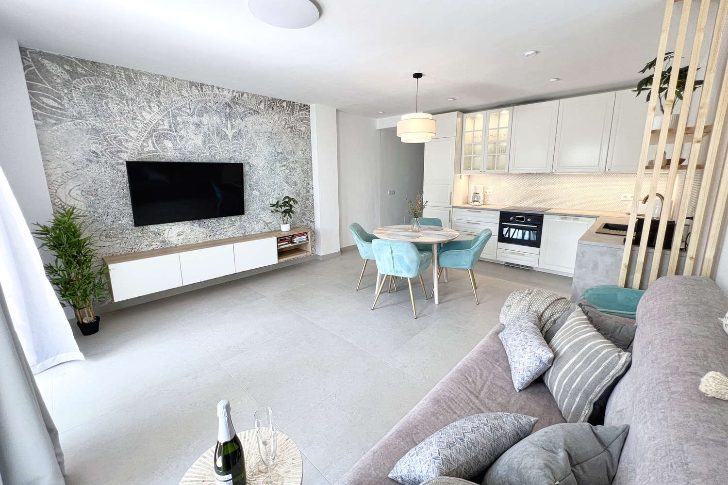 Innenbereich: Das geräumige Wohnzimmer bietet eine gemütliche Atmosphäre mit einem großen Fernseher und Highspeed-Internetanschluss, perfekt zum Entspannen nach einem Tag am Strand.