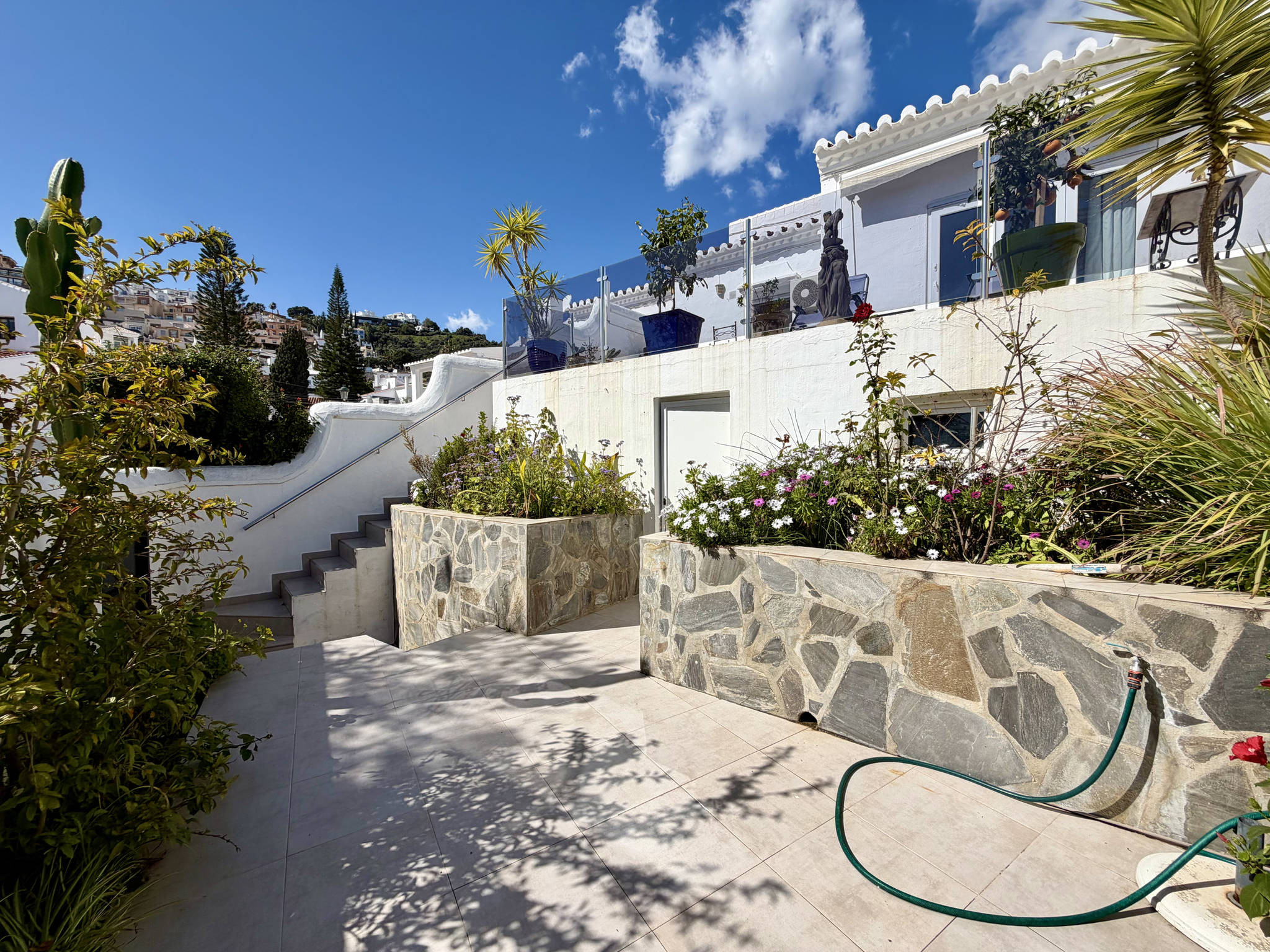 Der größte Vorteil dieser Wohnung ist ihr sehr großer Außenbereich, der sich über mehrere Ebenen erstreckt, die für mehr Komfort durch nur wenige Stufen miteinander verbunden sind. Wenn Sie durch die Glastür des Wohnzimmers treten, empfängt Sie die Hauptebene mit Liegestühlen zum Entspannen mit Meerblick und direkt rechts davon ein Bereich mit einem großen Tisch und einem Grill für Abendessen im Freien. Über ein paar Stufen gelangt man zu einer zweiten Ebene, die frei und von Blumen umgeben ist, ein idealer Ort, um die Ruhe zu genießen. Ein paar Stufen weiter unten befindet sich die untere Ebene, wo sich ein separater Raum mit der Waschmaschine und einem strategisch günstigen Nebeneingang befindet.Strategischer Zugang und Dienstleistungen der Wohnanlage