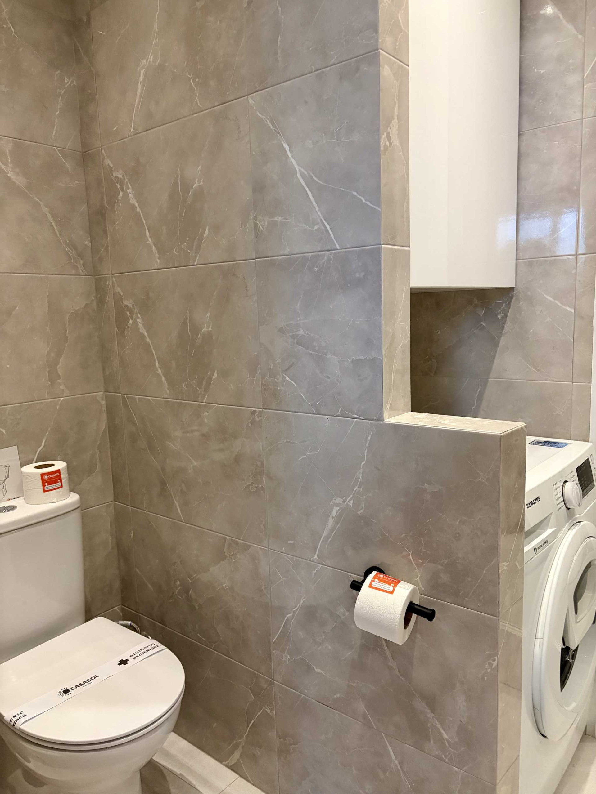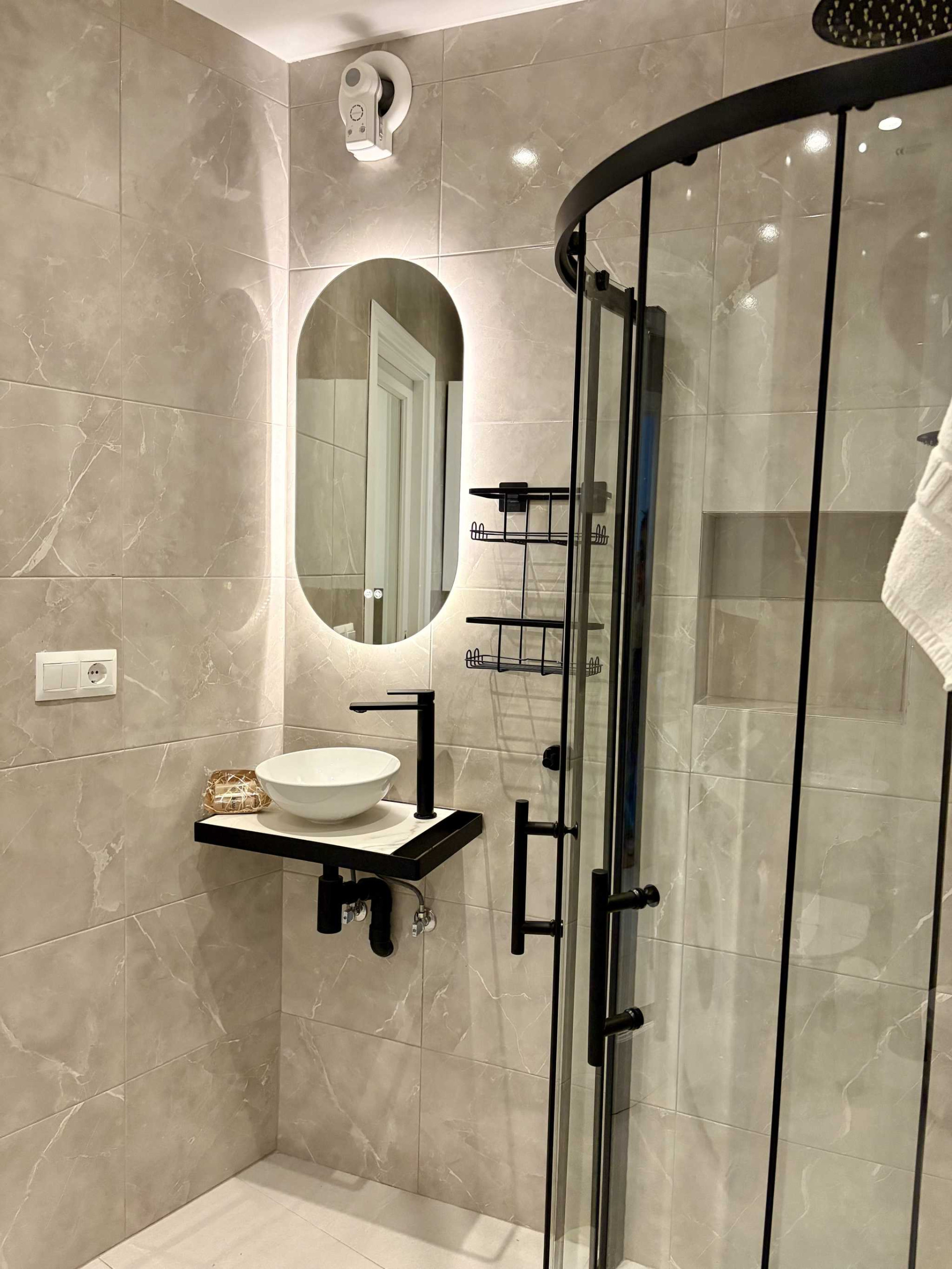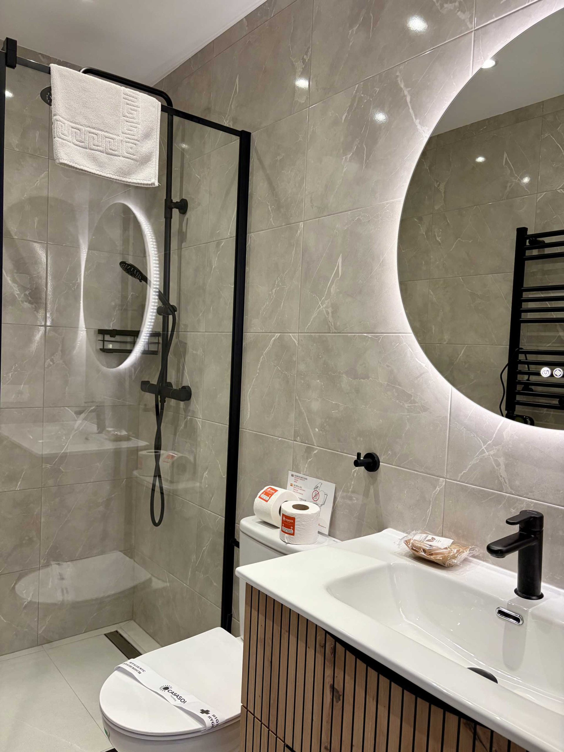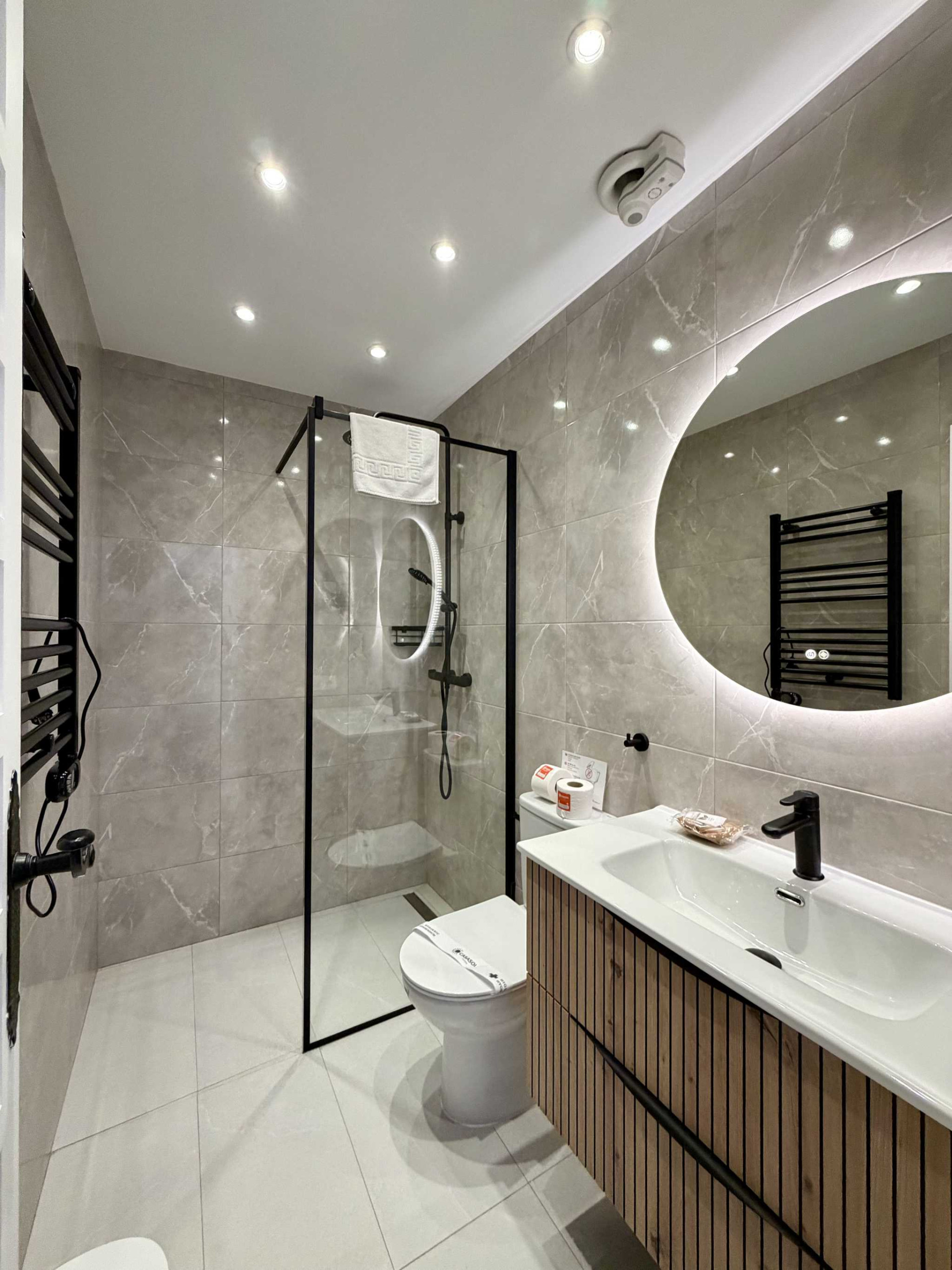 - Ein zweites modernes Badezimmer, das vom Flur aus zugänglich ist, mit Dusche, Toilette und eleganter Ausstattung.