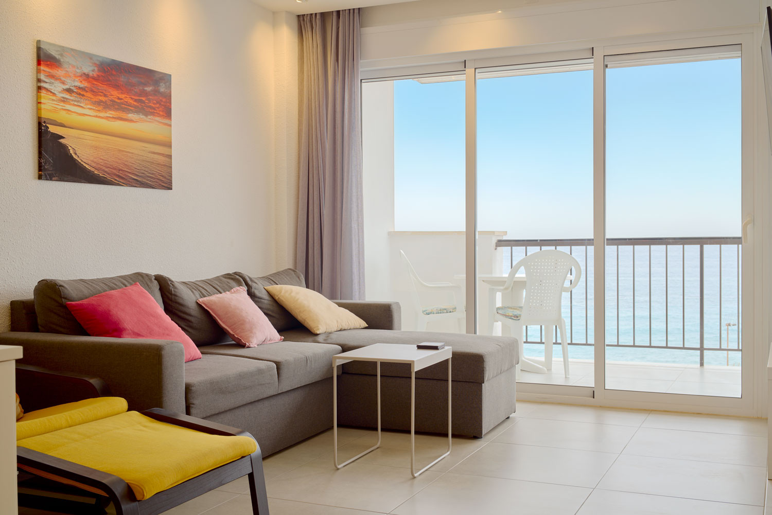 Das Wohnzimmer ist mit einer privaten Terrasse verbunden, die denselben unendlichen Panoramablick bietet. Es ist der perfekte Ort, um die Meeresbrise in völliger Privatsphäre zu genießen. Das Gebäude bietet auch Zugang zu einem Gemeinschaftspool mit Liegestühlen und Sonnenschirmen, der eine erfrischende und ruhige Alternative zum Sandstrand darstellt, der praktisch vor der Haustür liegt.Warum Sie Arce I 26 für Ihren Urlaub wählen sollten