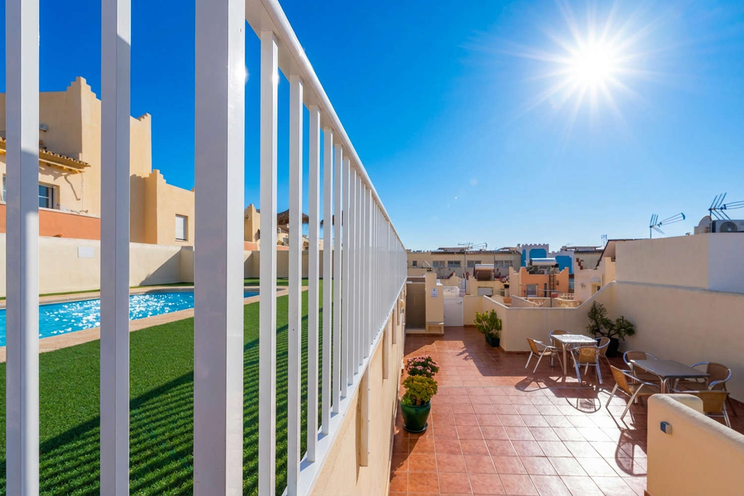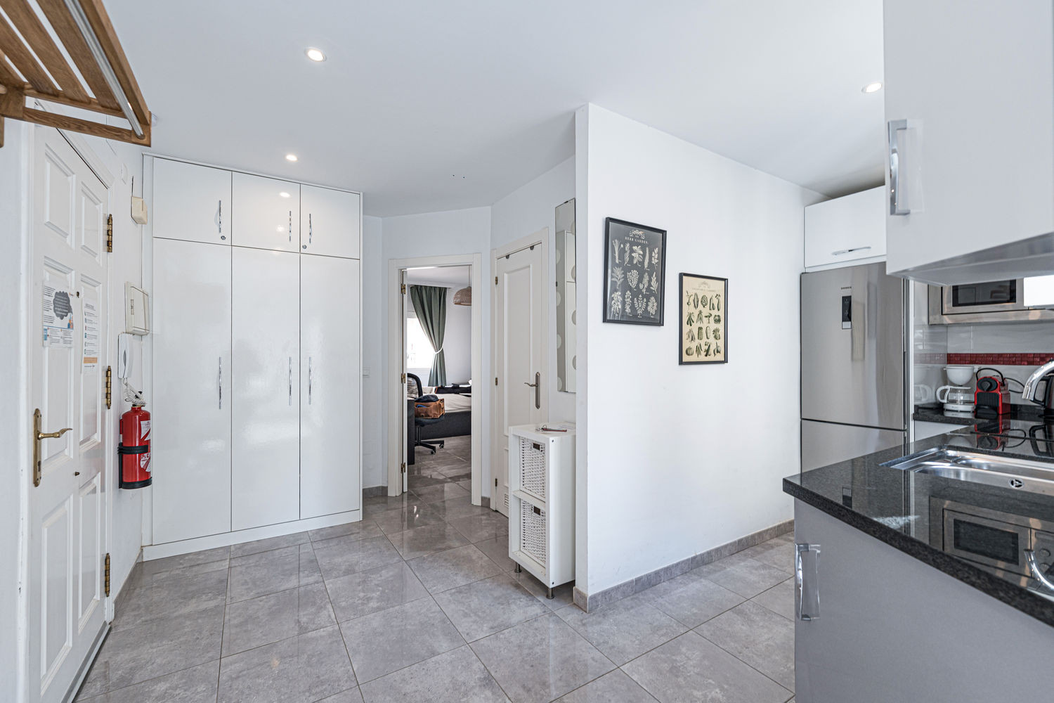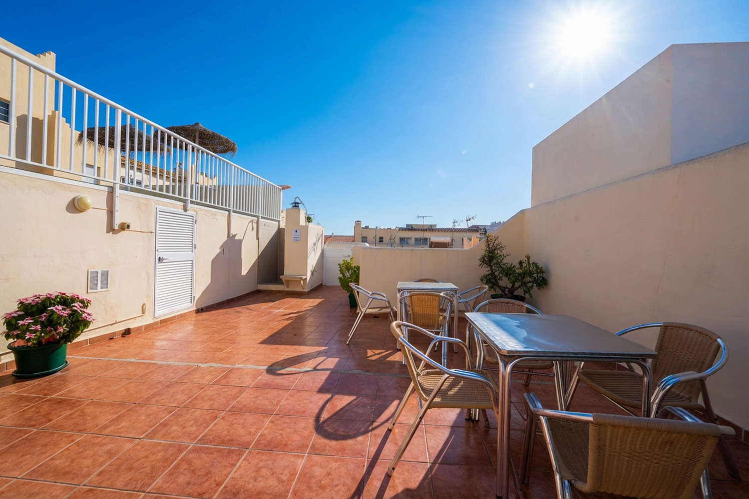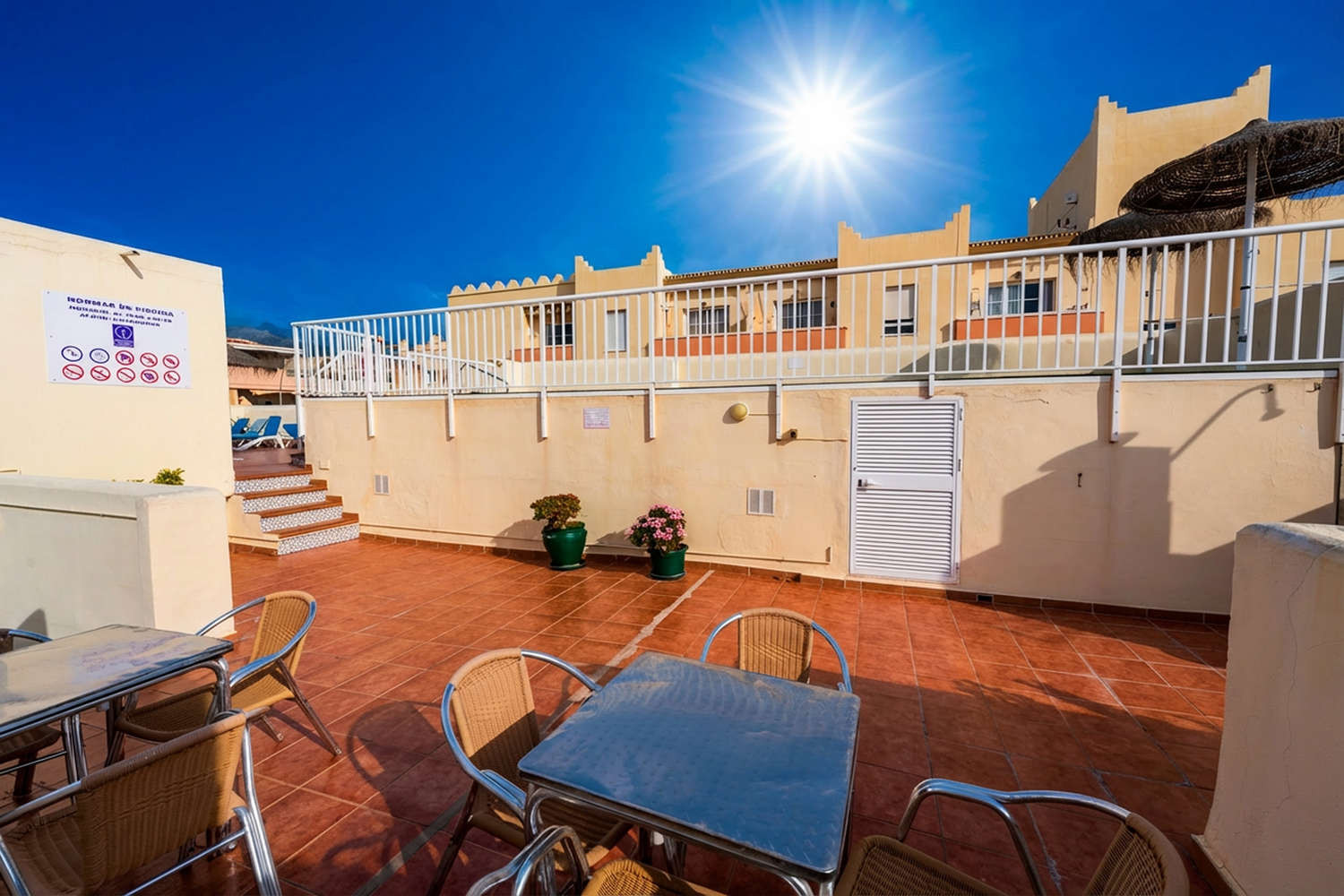 Der Innenraum wurde modernisiert, um eine strukturierte und technologisch hochwertige Atmosphäre zu bieten. Im Wohnzimmer steht Ihnen ein TV mit über 190 internationalen Kanälen zur Verfügung. Das Schlafzimmer mit großem Doppelbett verfügt über ein Detail, das besonders für längere Aufenthalte geschätzt wird: einen eigenen Schreibtisch mit Lampe. Dank des Highspeed-Glasfaser-WLANs eignet sich dieser Bereich ideal für kurze Erledigungen oder Workations, wobei Erholung und Konnektivität perfekt kombiniert werden.Andalusische Urbanisation mit Pool auf der Dachterrasse