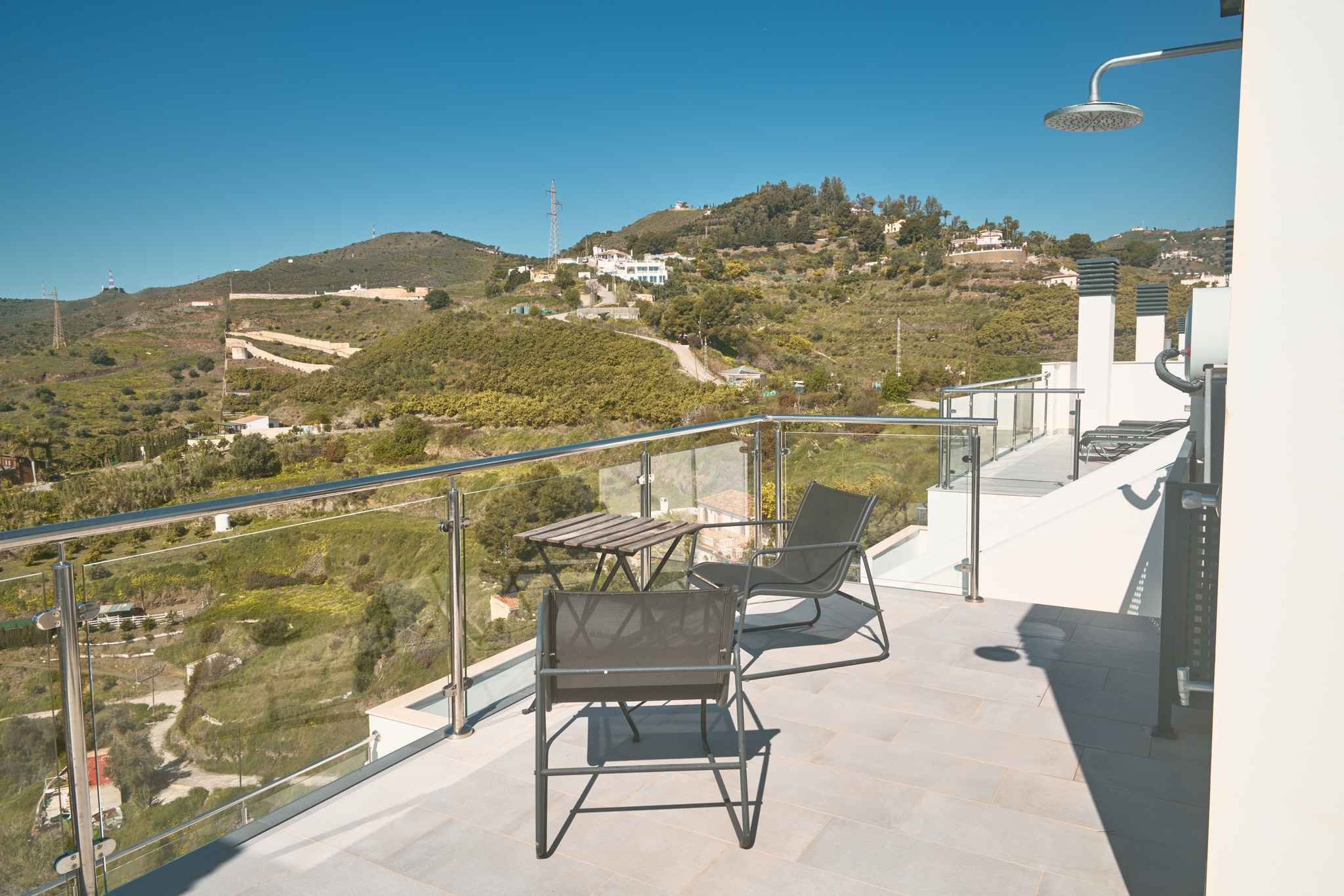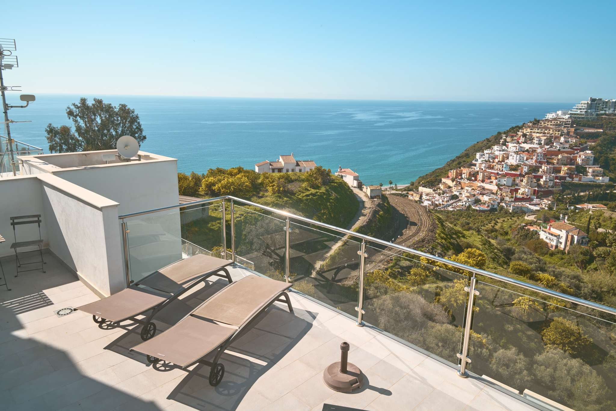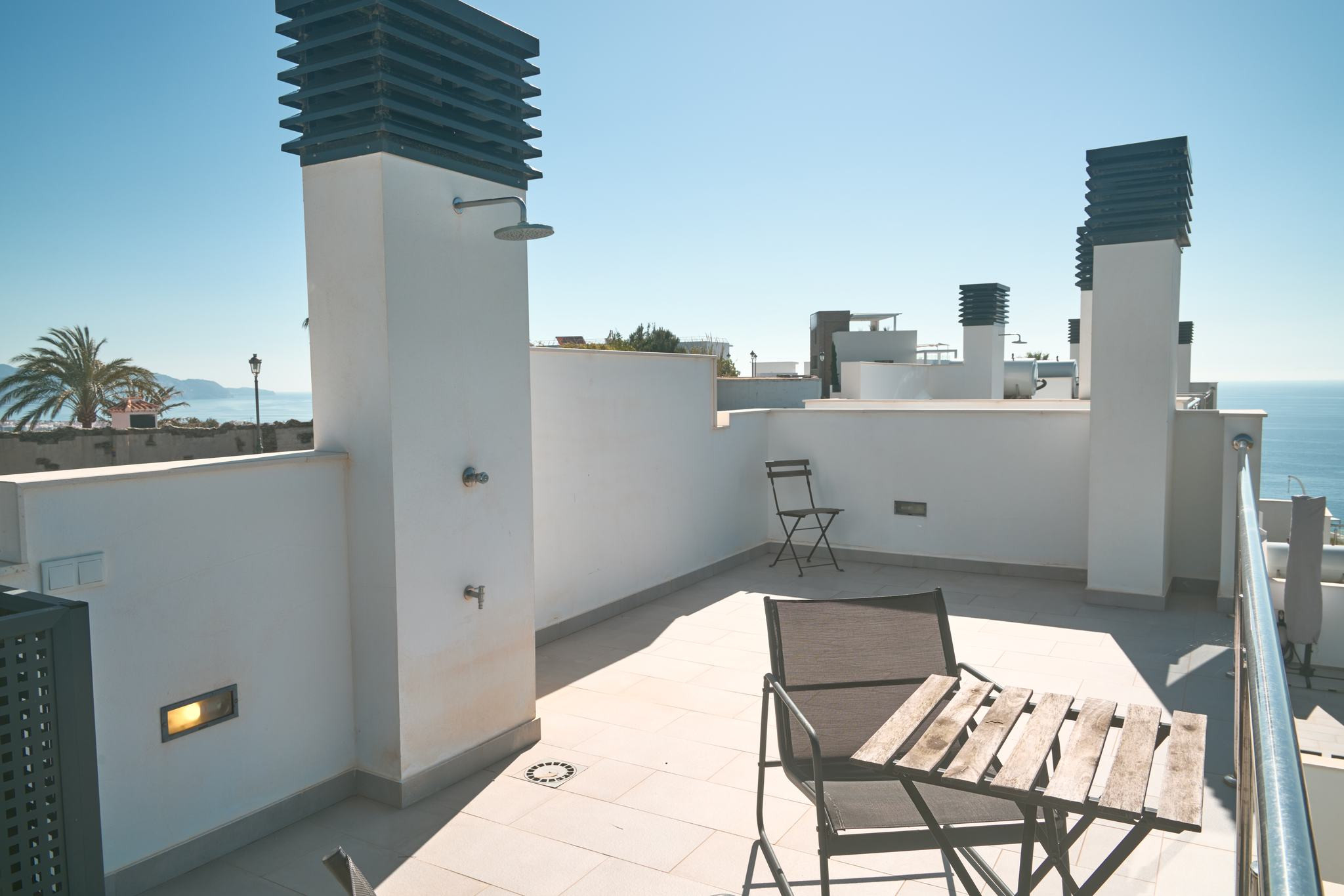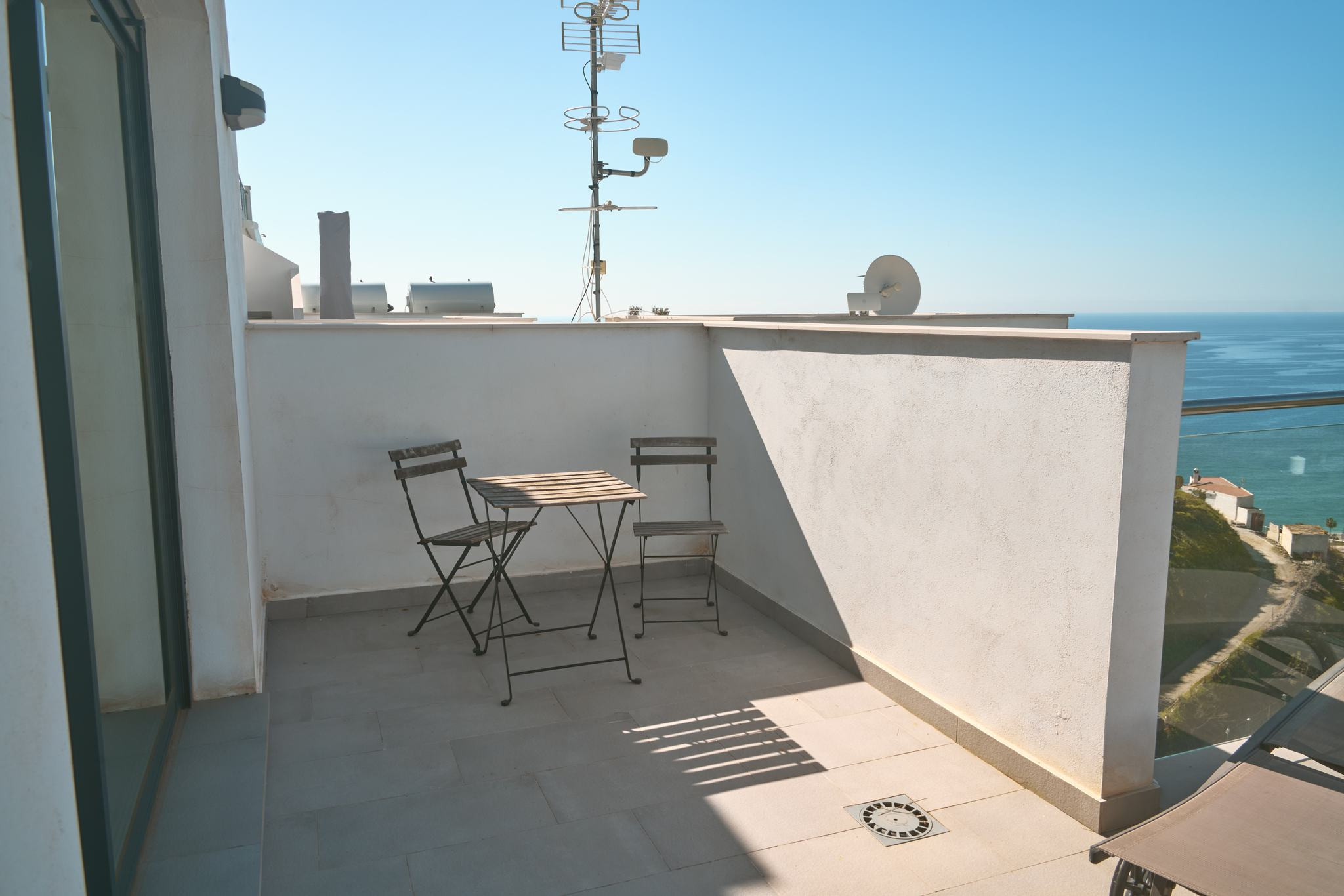 Da es sich um einen Neubau in erhöhter Lage handelt, bietet sich von allen drei Außenebenen ein direkter und beeindruckender Meerblick. Die oberste Dachterrasse verfügt über eine Außendusche, ideal, um sich nach einem Vormittag am Strand in absoluter Privatsphäre zu erfrischen. Die technische Ausstattung entspricht dem Standard einer modernen Wohnanlage und umfasst Highspeed-WLAN sowie Fernsehen mit internationalen Kanälen, um nach einem Tag voller Erkundungen in Nerja zu entspannen.