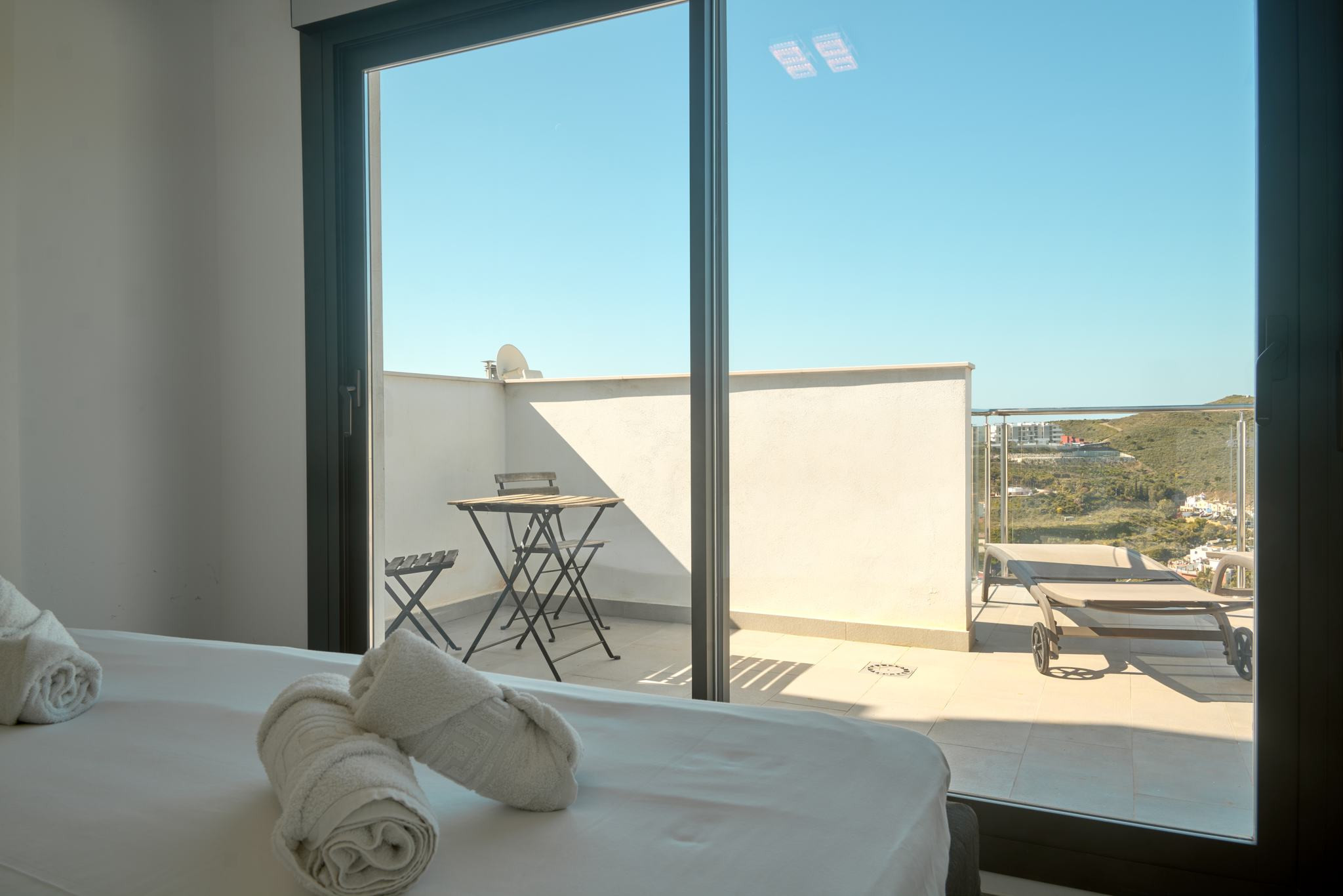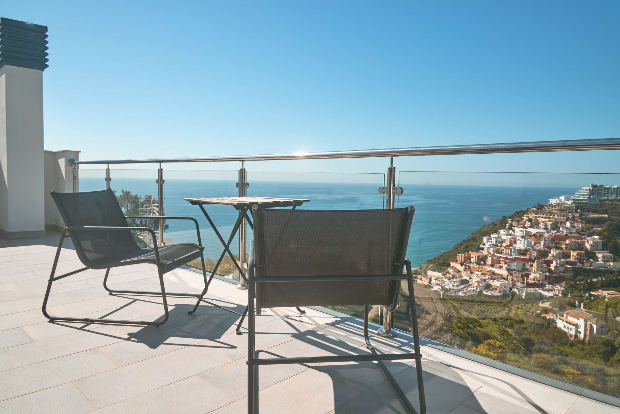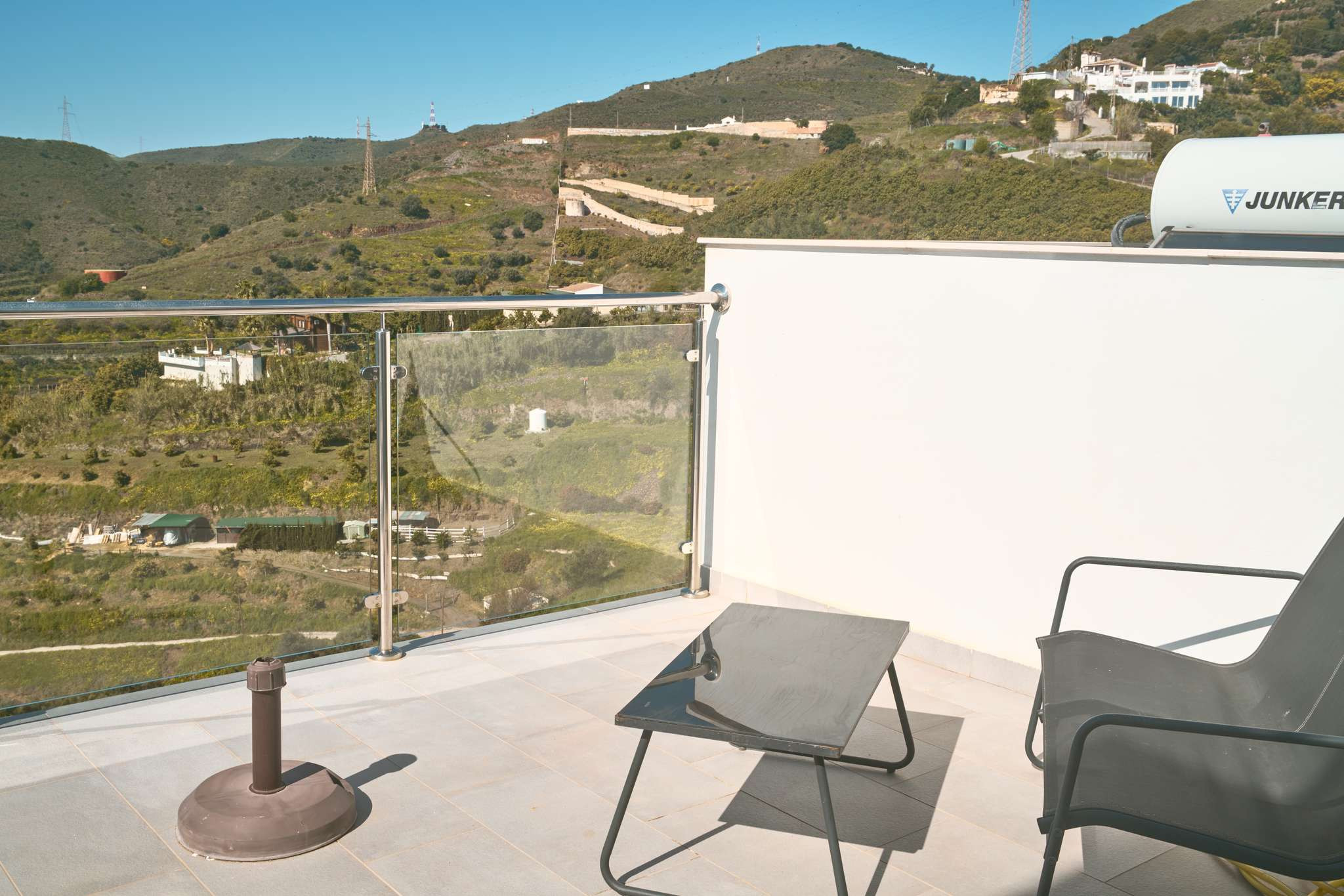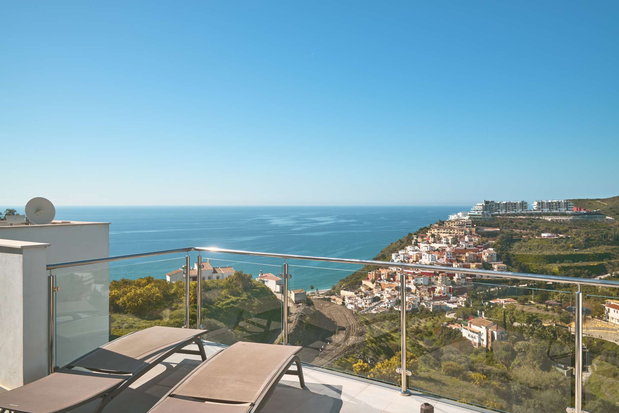 Da es sich um einen Neubau in erhöhter Lage handelt, bietet sich von allen drei Außenebenen ein direkter und beeindruckender Meerblick. Die oberste Dachterrasse verfügt über eine Außendusche, ideal, um sich nach einem Vormittag am Strand in absoluter Privatsphäre zu erfrischen. Die technische Ausstattung entspricht dem Standard einer modernen Wohnanlage und umfasst Highspeed-WLAN sowie Fernsehen mit internationalen Kanälen, um nach einem Tag voller Erkundungen in Nerja zu entspannen.