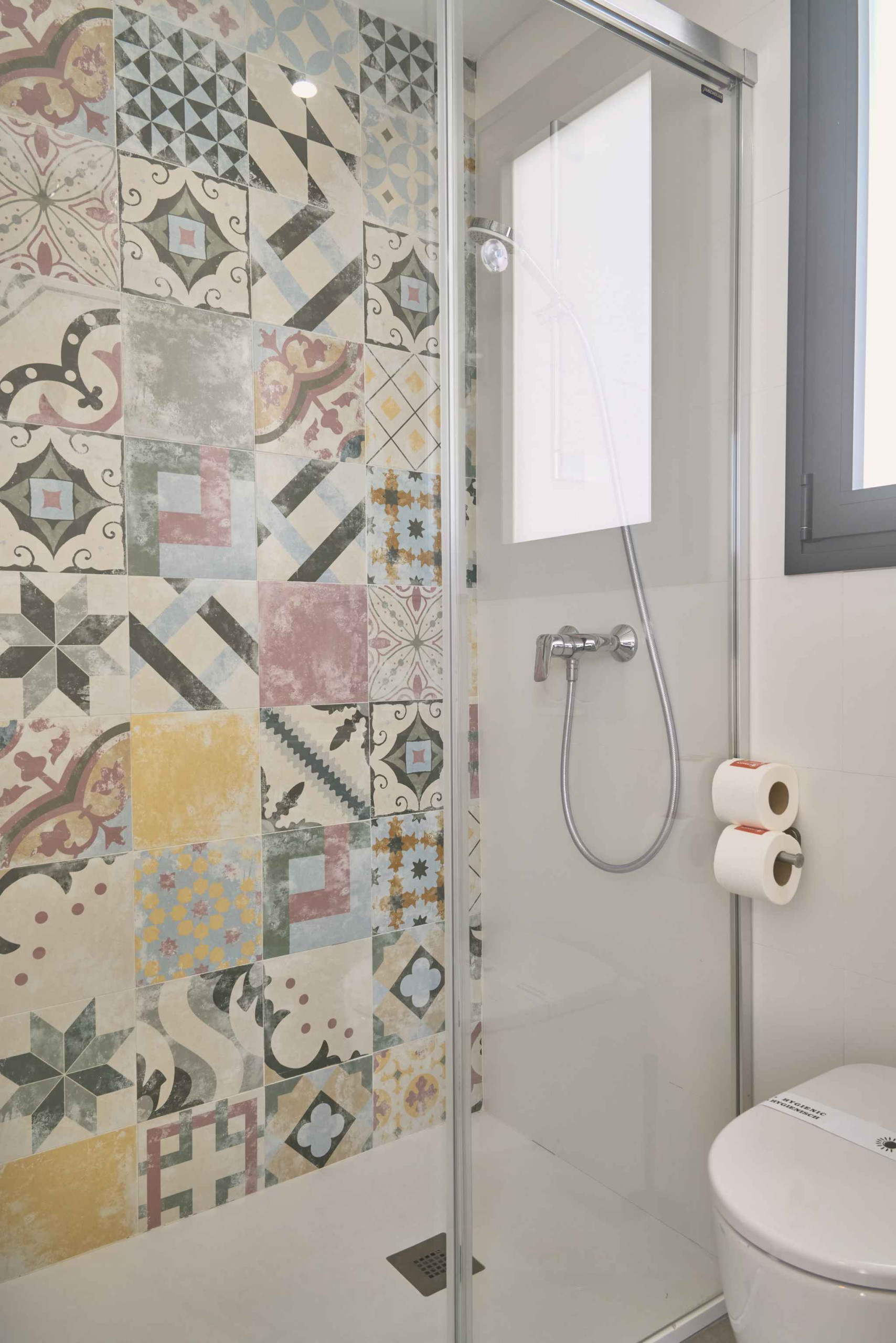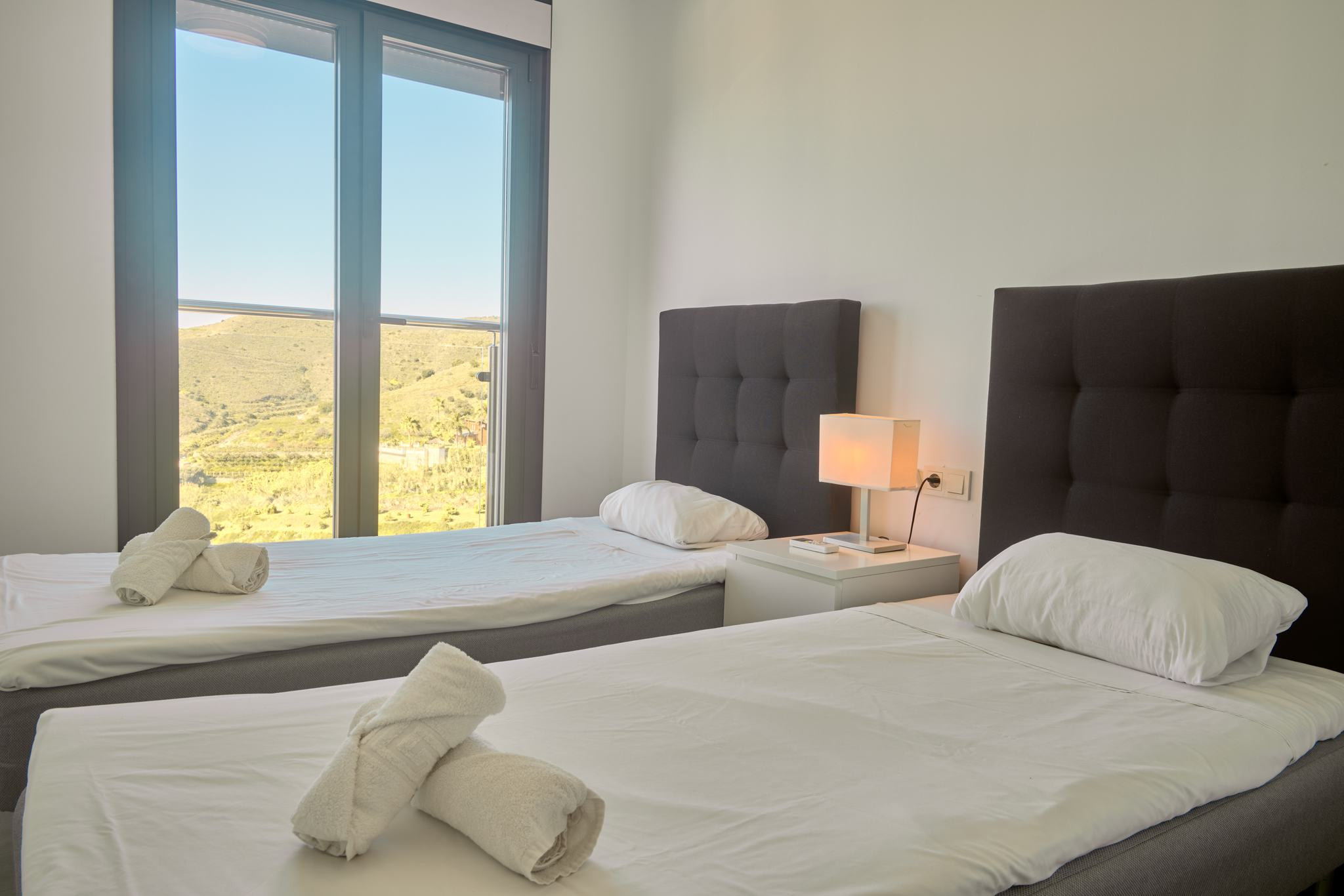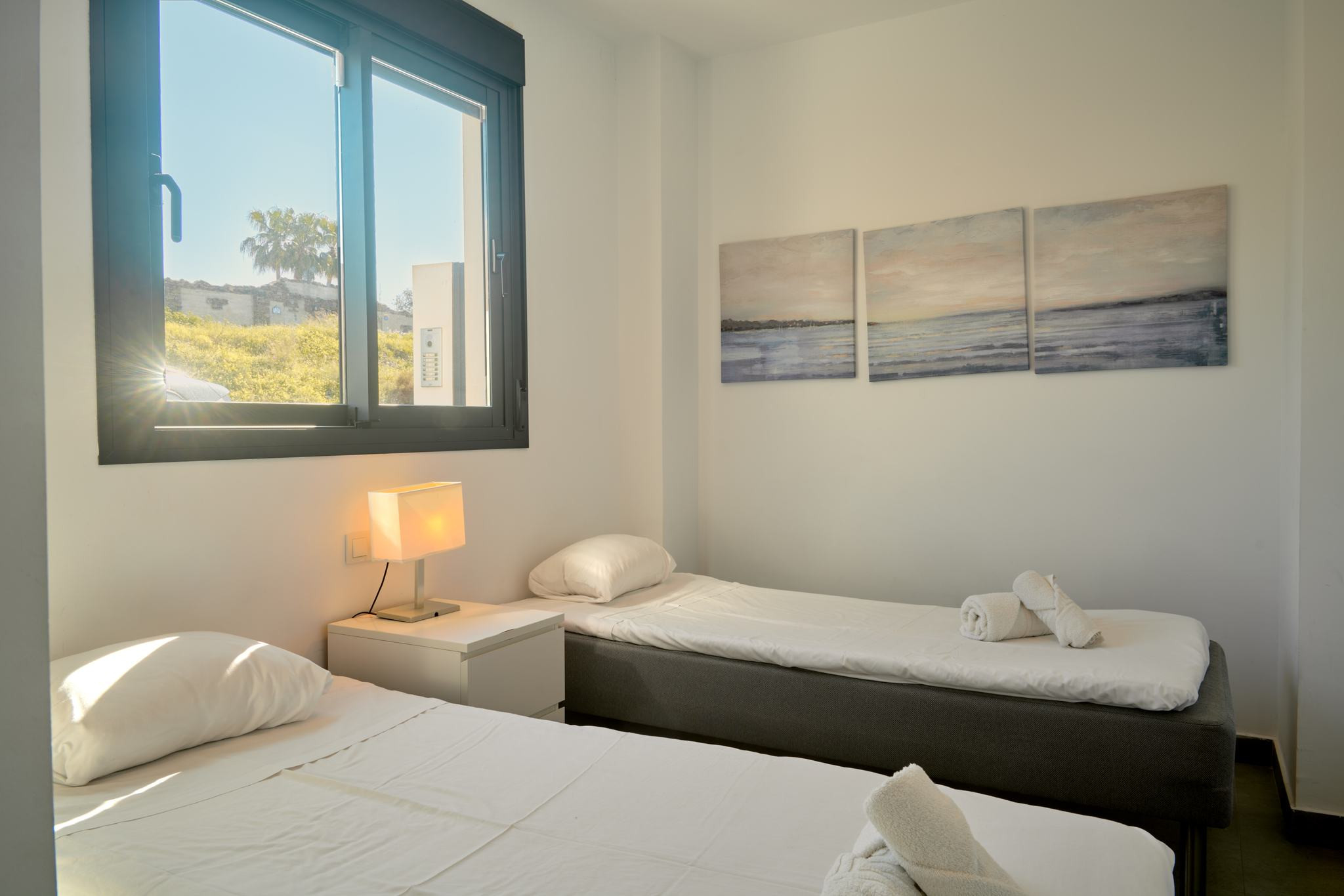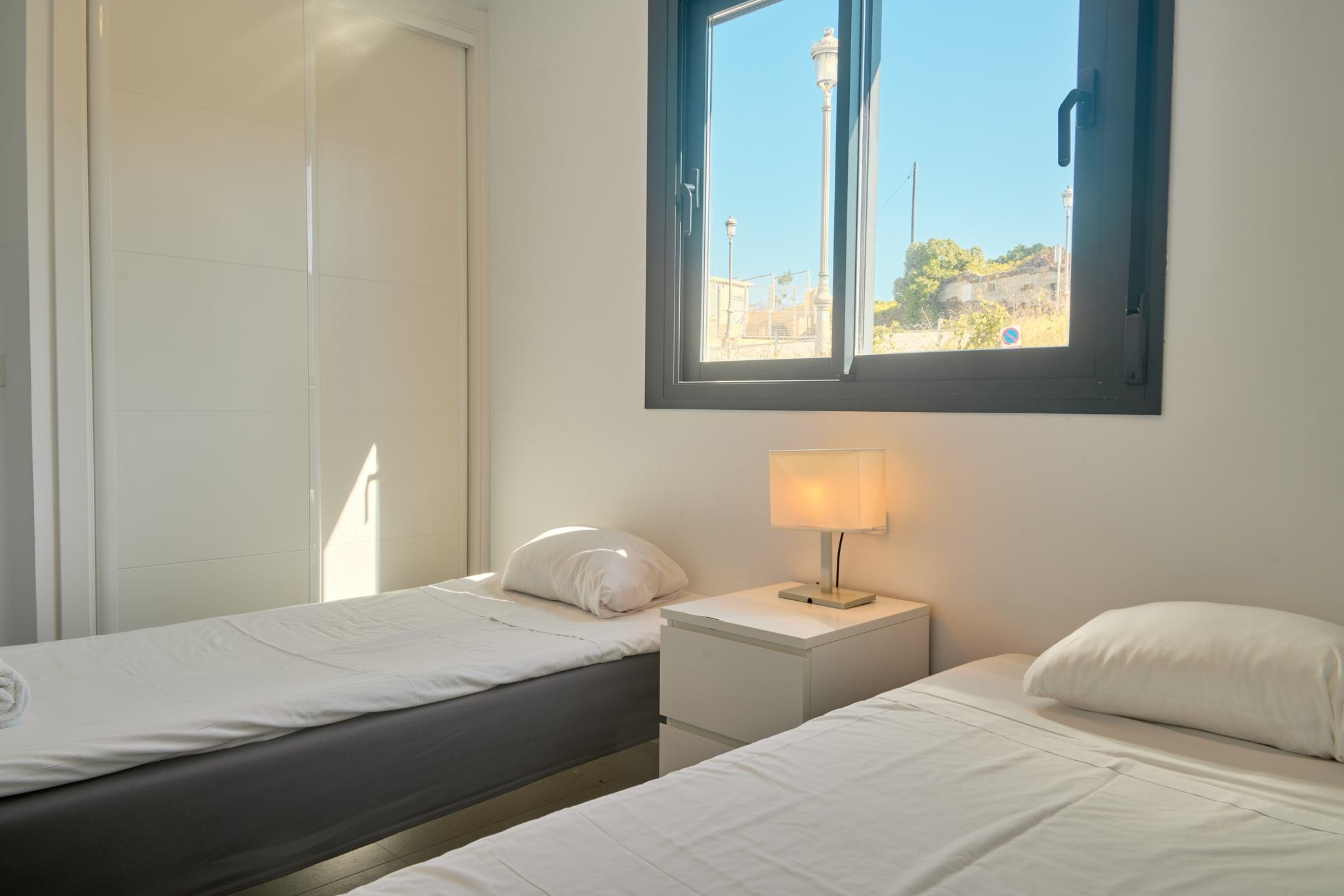 Die Unterkunft ist praktisch für Gruppen von bis zu 6 Personen eingerichtet. Im Erdgeschoss befinden sich das Wohnzimmer mit integrierter Küche, zwei Schlafzimmer mit Einzelbetten und ein Badezimmer mit Dusche. Das Obergeschoss ist dem Hauptschlafzimmer mit Doppelbett und einem zweiten Badezimmer mit Dusche vorbehalten. Von dieser Ebene aus gelangt man auf eine private Terrasse, die als Durchgang zur Dachterrasse zur exklusiven Nutzung dient und je nach Tageszeit unterschiedliche Bereiche mit Sonne und Schatten bietet.