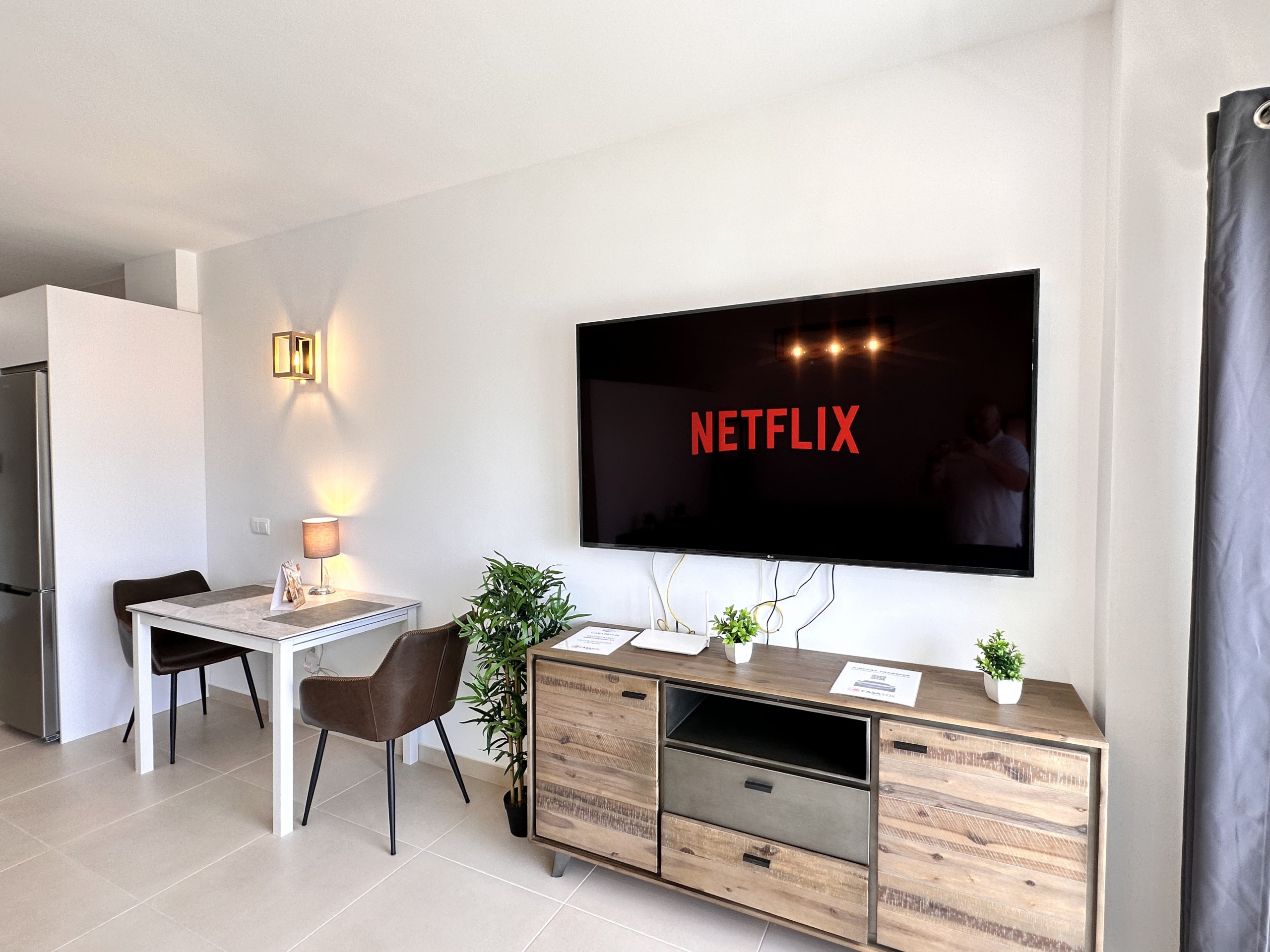 Wenn Sie das Studio betreten, werden Sie von den modernen Annehmlichkeiten begeistert sein, die für Ihren größtmöglichen Komfort sorgen. Ein eleganter 65-Zoll-Smart-TV mit internationalen Kanälen und High-Speed-Internet sorgen während Ihres gesamten Aufenthalts für Unterhaltung und Konnektivität.