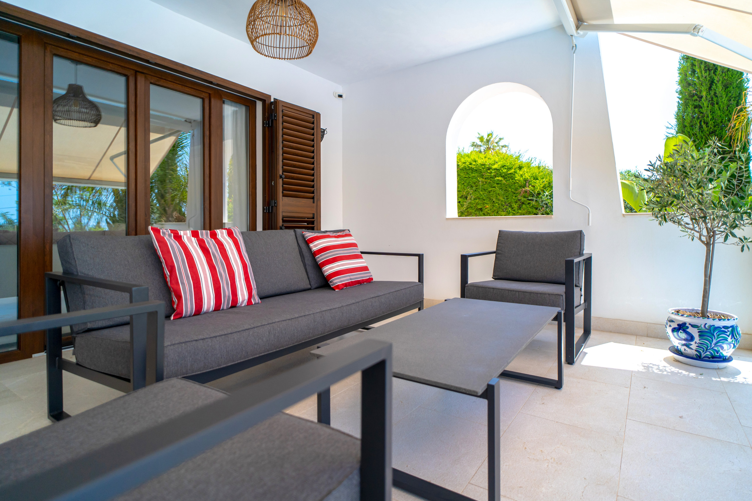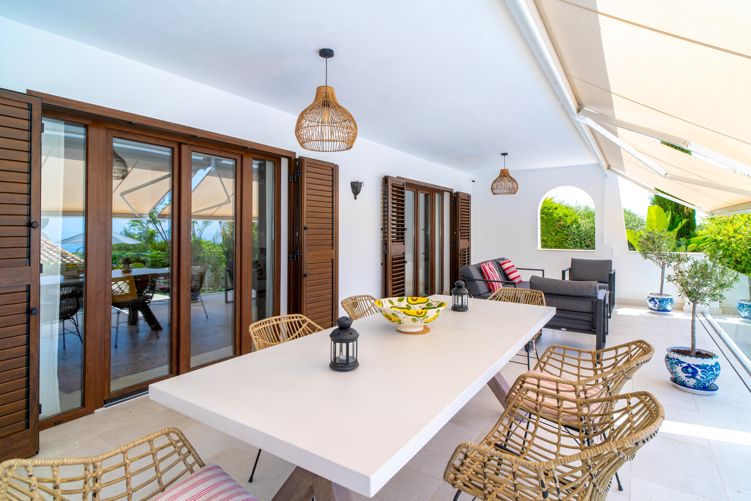 Der wahre Luxus der Villa beginnt, sobald Sie das Wohnzimmer betreten und auf die elegante 40 m² große Terrasse mit Meerblick, einem komfortablen Loungebereich und einem Sonnendach treten – ideal zum Speisen im Freien, zum Lesen oder einfach zum Entspannen.