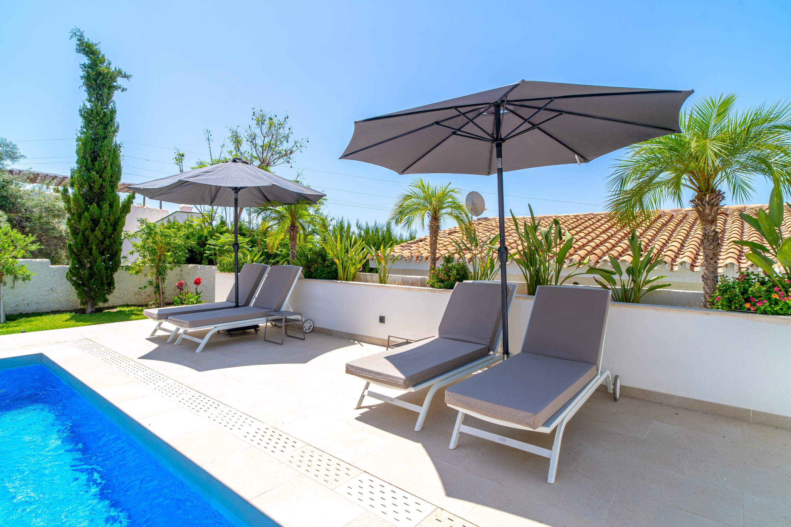 Von diesem einladenden Bereich gelangen Sie weiter zum weitläufigen 70 m² großen Poolbereich, wo ein großer 6 x 4 m großer Privatpool auf Sie wartet. Umgeben von eleganten Chill-out- und Loungebereichen, Sonnenliegen und einem üppigen tropischen Garten mit Palmen bietet er den ultimativen Rahmen, um sich stilvoll und ungestört zu entspannen.