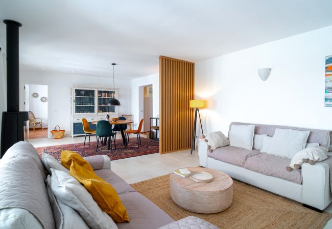 Ein helles Wohnzimmer mit großen mallorquinischen Fenstern verbindet die Villa mit der Hauptterrasse und bietet eine elegante und einladende Atmosphäre.