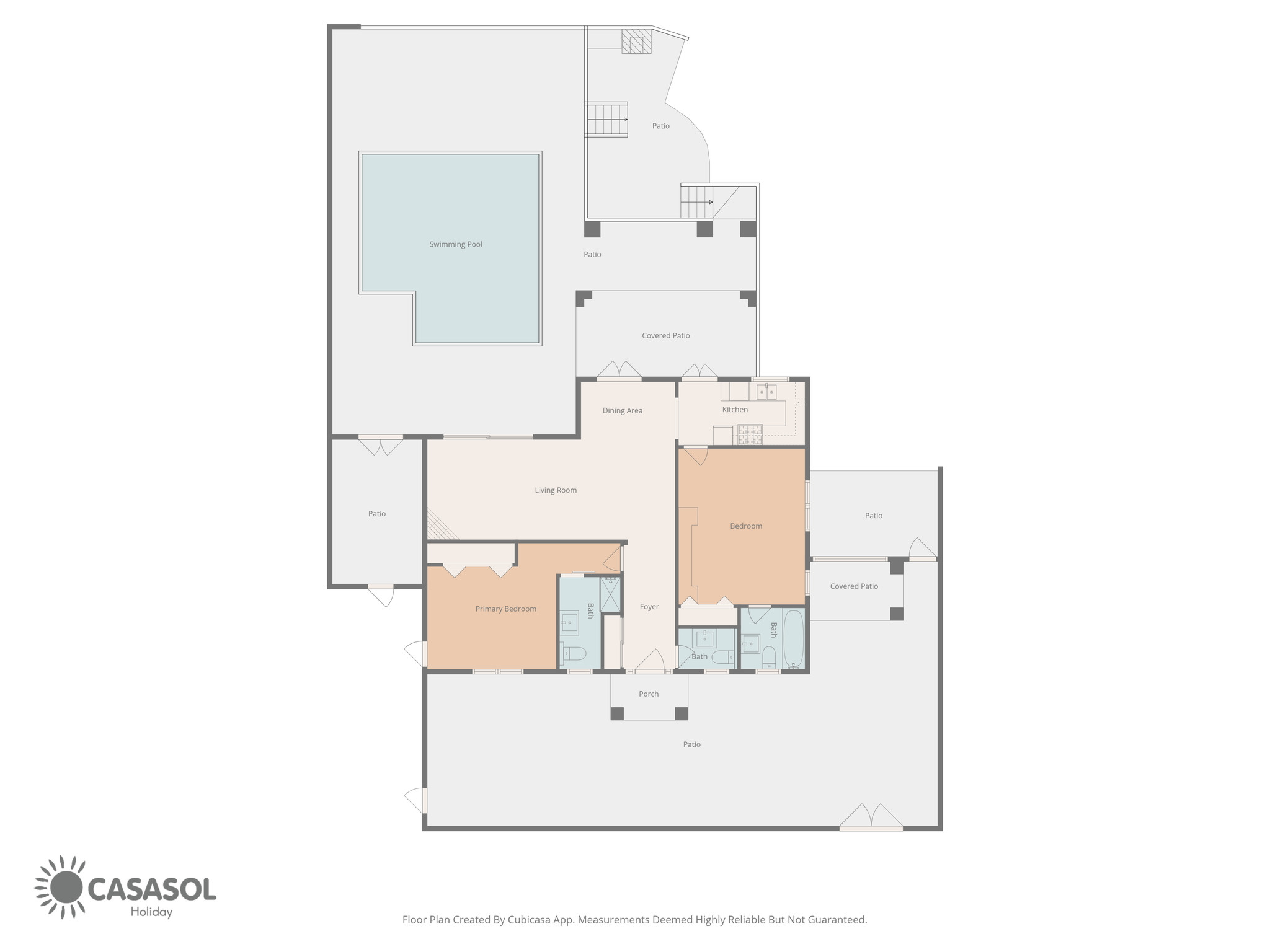Die Aufteilung des Hauses ist auf den Komfort von vier Personen ausgelegt. Beim Betreten des Hauses steht ein praktisches Gäste-WC für die Gemeinschaftsbereiche zur Verfügung. Auf der linken Seite befindet sich das erste Schlafzimmer, ausgestattet mit einem hochwertigen Doppelbett und einem eigenen Bad. Das in einem zeitgemäßen und gemütlichen Stil eingerichtete Wohnzimmer geht in eine voll ausgestattete, halboffene Küche über. Auf der anderen Seite des Raums verfügt das zweite Schlafzimmer ebenfalls über ein eigenes Badezimmer und ein Doppelbett. Diese „Doppel-Suite“-Konfiguration gewährleistet, dass jedes Paar oder jeder Gast seinen eigenen privaten Bereich hat, ohne das Badezimmer teilen zu müssen.
